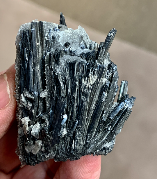 Bonsoir. Puisse que c’est une page Stibine ;) je poursuis avec cette petite pièce acquise dans ma jeunesse dont je ne me souvenais absolument plus. C’est mon fils qui me l’a retrouvé tout récemment au fond d’un carton. Possédant un autre exemplaire bien plus massif exactement similaire et lui parfaitement identifié  j’ai pu refaire une étiquette pour cette Stibine de Ty Gardian recouverte de quartz 3cm x 2 x 2