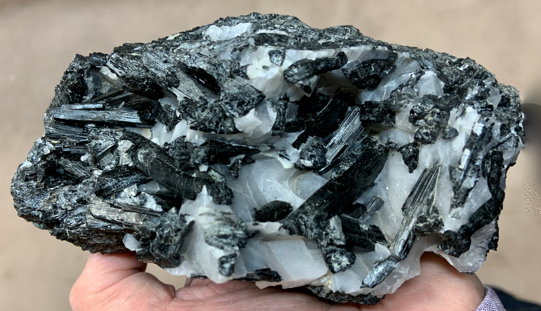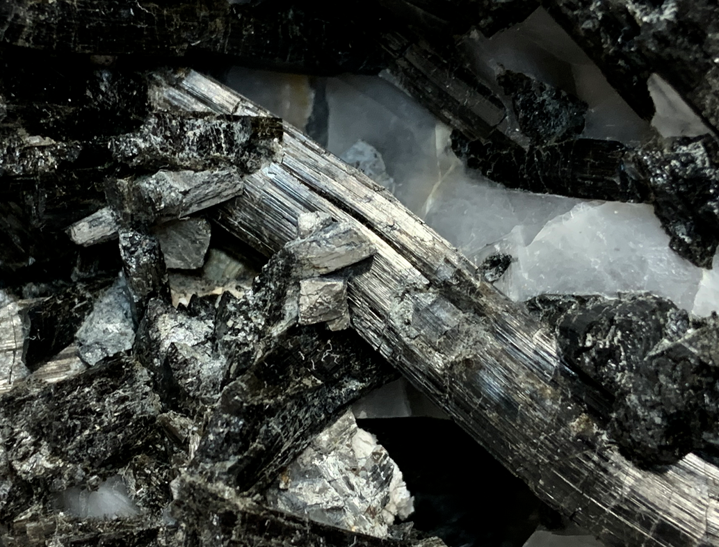 Tourmaline schorl en cristaux automorphes, tordus et brisés dans le Quartz gras ; il existe de plus un silicate en cristaux gris mat d'habitus monoclinique (DIopside ??)  [140mm]
