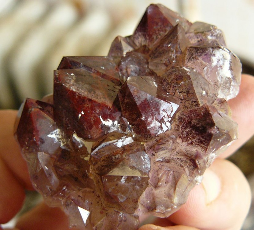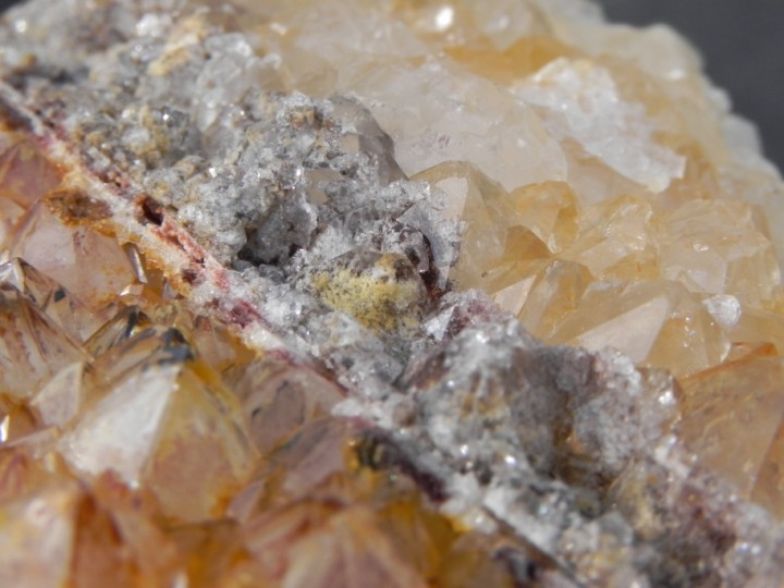 Juste au dessus du filon d'hématoïde, il y avait une petite poche de fumés. Ces quartz sont plus ou moins recouverts d'une très fine couche de calcédoine. Plus curieux, certains des prismes sont recouverts d'une seconde génération de petits quartz translucides biterminés (sur la seconde photo; difficile de les distinguer).
