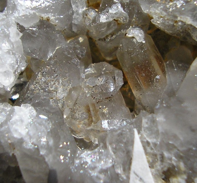 9)Sphérules brun très clair à marron (0,1 à 0,2 mm) + aiguille blanche dans un cristal de Quartz (env. 1,2mm) (Batz sur mer). Pourraient également être des phosphates.