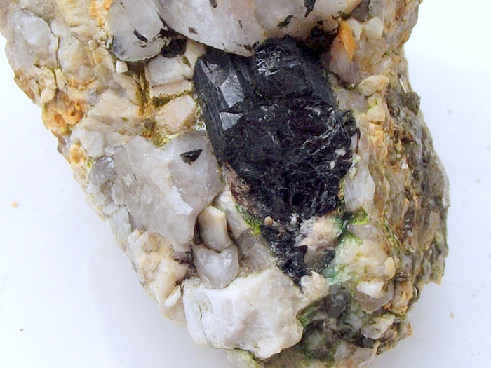 3)APATITE verte 5 mm dans ORTHOSE du Croisic. Elles peuvent être bien cristallisées et même gemme mais alors de petite taille. Parfois dans le Schorl.