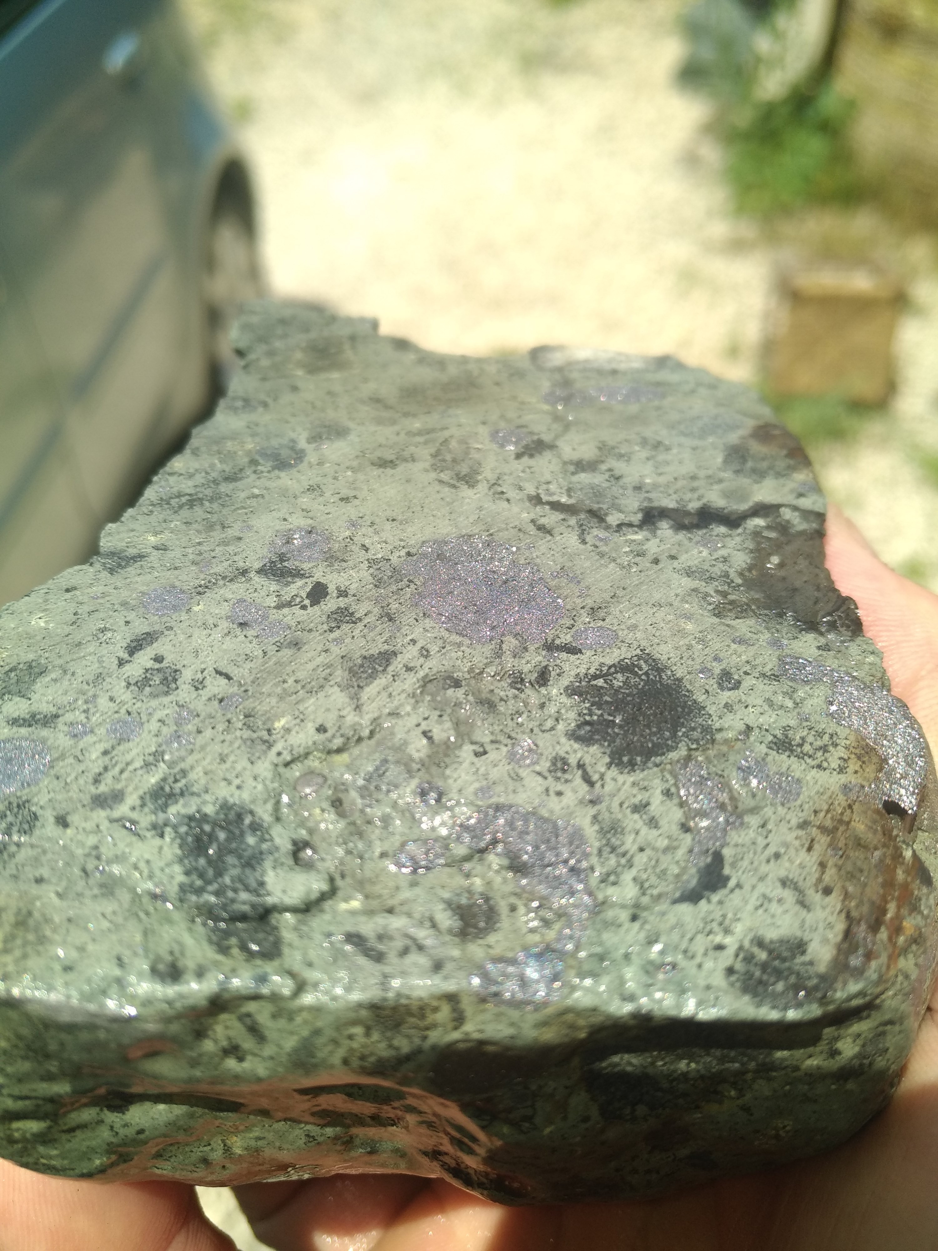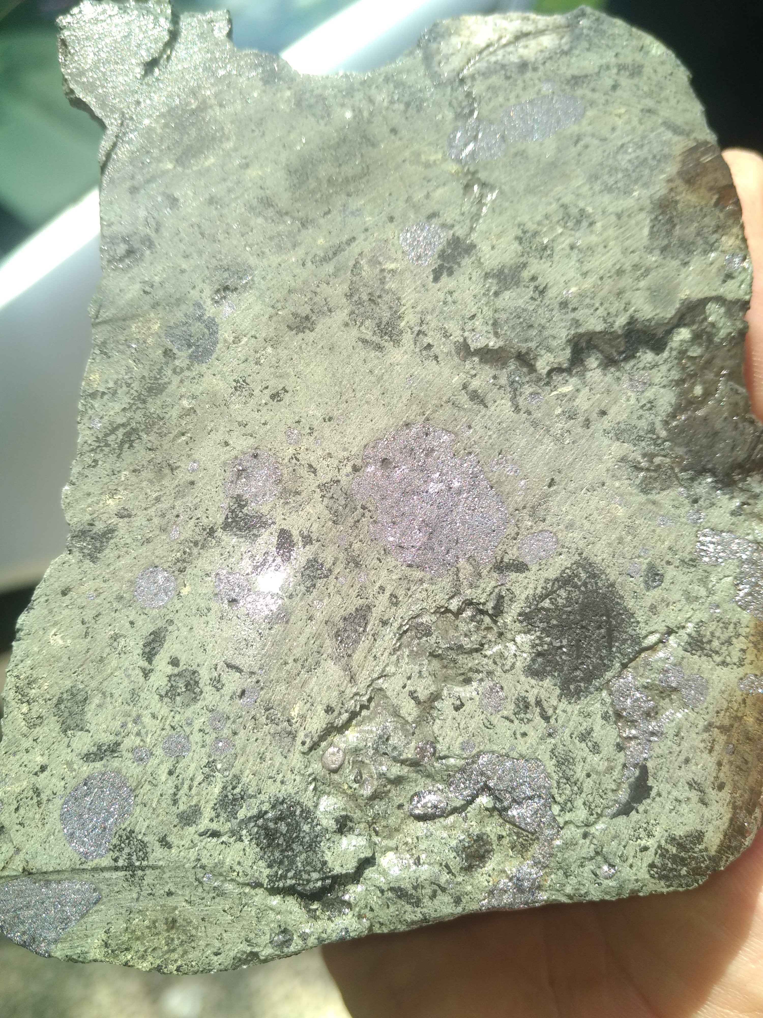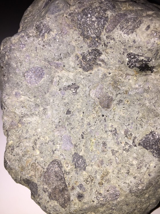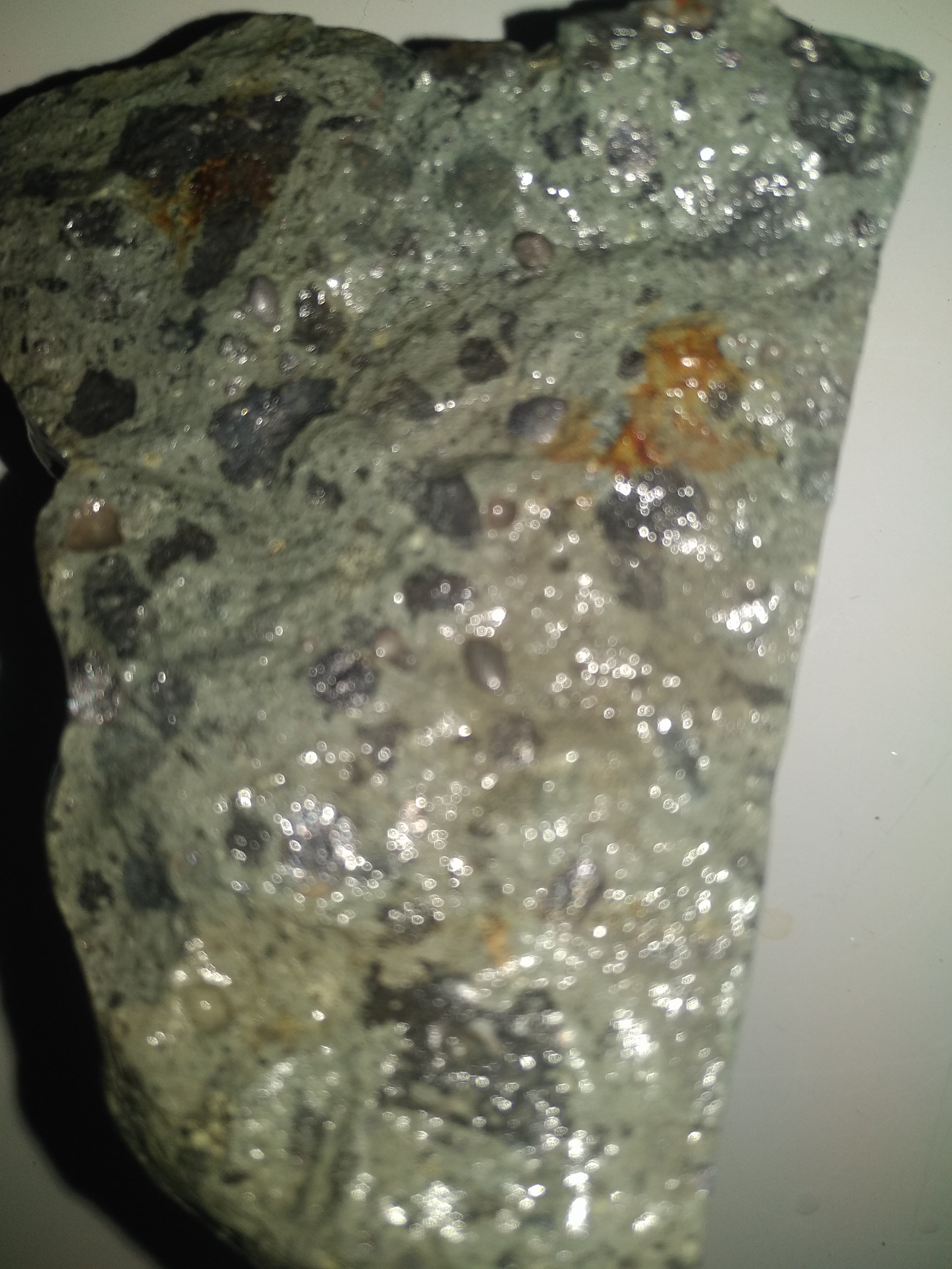 Là, c’est plus net mais ça n'a plus grand-chose à voir avec un résidu métallurgique ou alors des scories prises dans du ciment: c'est quoi cette matrice verdâtre? Il faudrait l'avis des géologues.