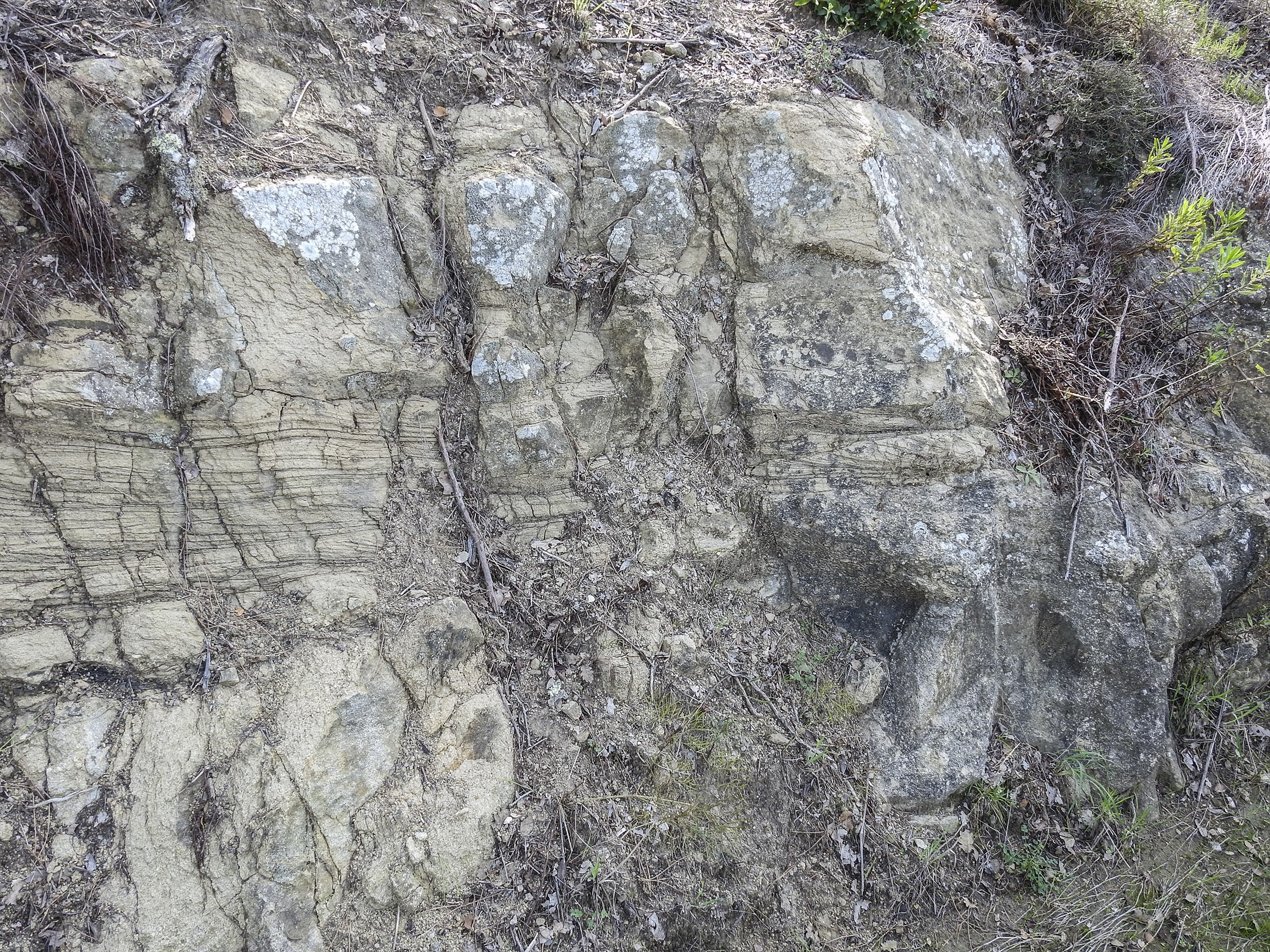 On notera les stratifications obliques, sans oublier que l'affleurement, un talus de piste pris en photo, donne une vision en 2D, les pendages pouvant dans certains niveaux être pentés vers l'observateur ou l'inverse. Bref, ne jamais oublier la vision 3D des objets.