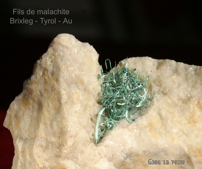 photo du jour pour les amateurs : une curiosité méconnue chez nous > des fils de malachite (sur cuivre natif ?) de Brixleg - Tyrol - Autriche. Ces cristaux se trouvent dans des dolomies. Un article dans Lapis avait détaillé le gisement il y a qq années (si certains ont vu).