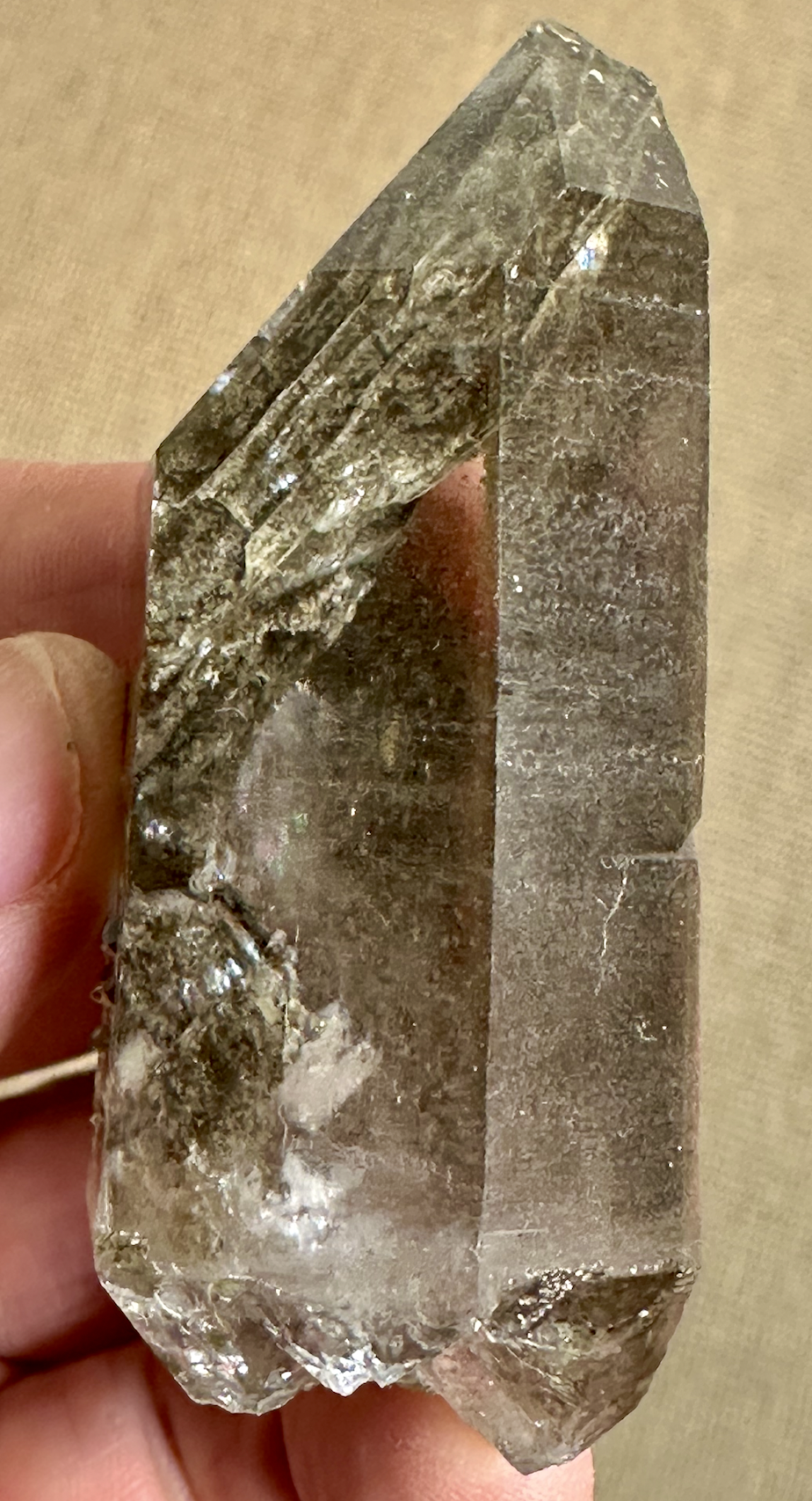Quartz non macromosaïque, chlorite en inclusions 'prase' (sans qu'elle n'attaque les faces) ; scars (empreintes) sphériques d'une sidérite cristallisée en sphérules, dissoute  [120mm]