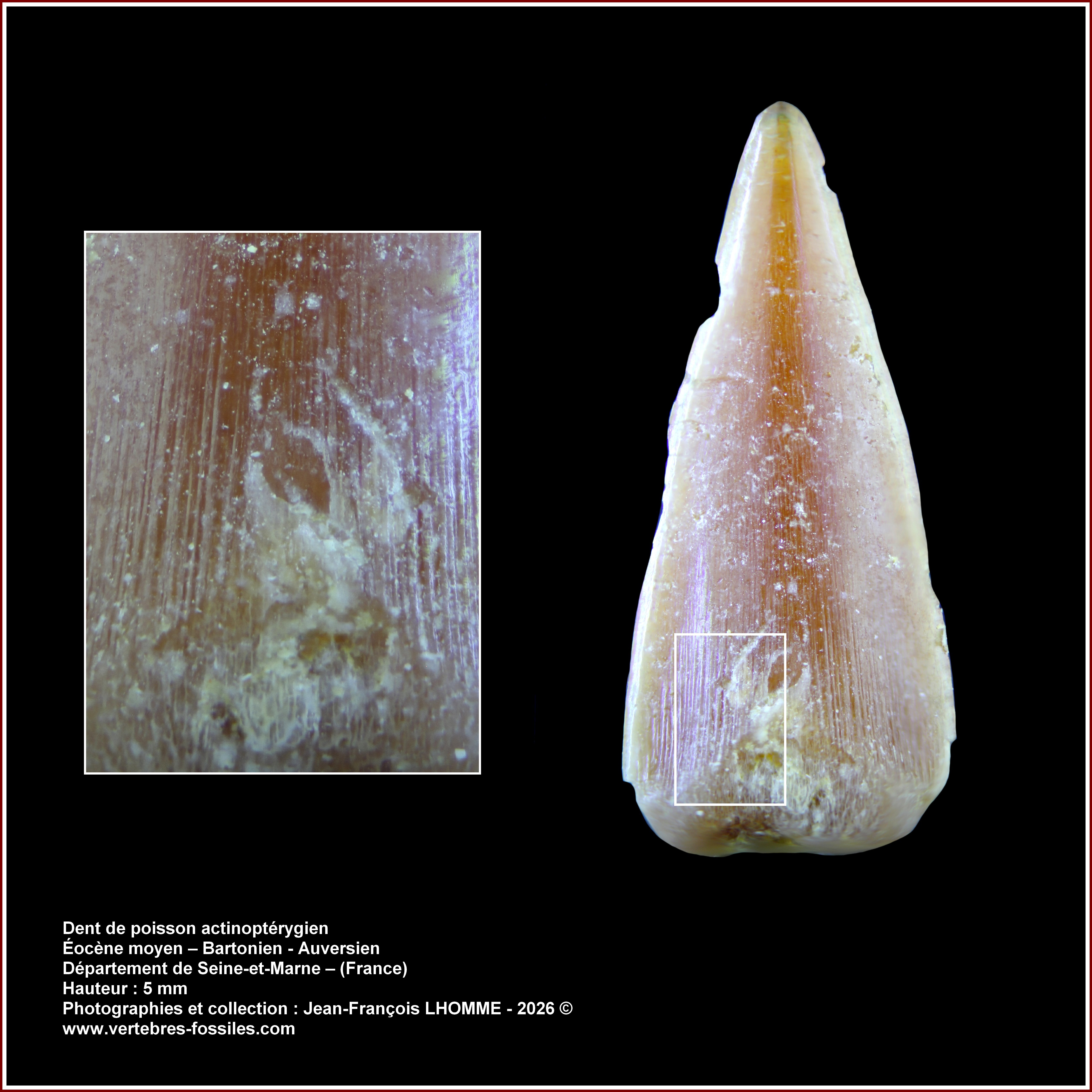 Une nouvelle dent d'Eotrigondon serratus du Lutétien inférieure, de l'ancien gisement de Gisors, j'attribue ces dents non pas à des dents pharyngiennes comme souvent, en forme de petits crochets, mais plutôt à des dents buccales, cependant cela ne reste qu'une hypothèse, tant le sujet est peu étudié, si toutefois vous avez des idées, n'hésitez pas à m'en faire part.