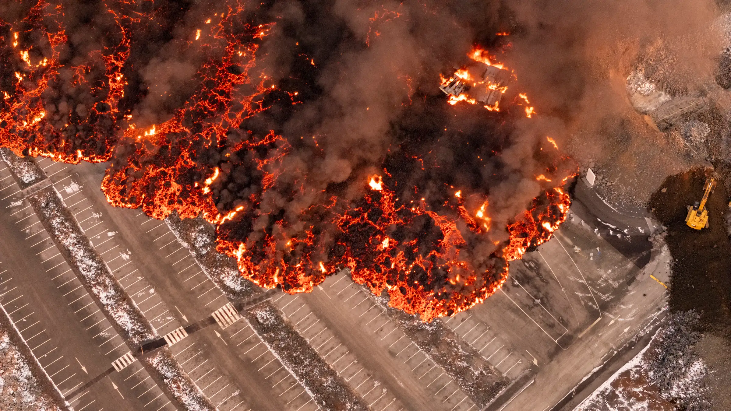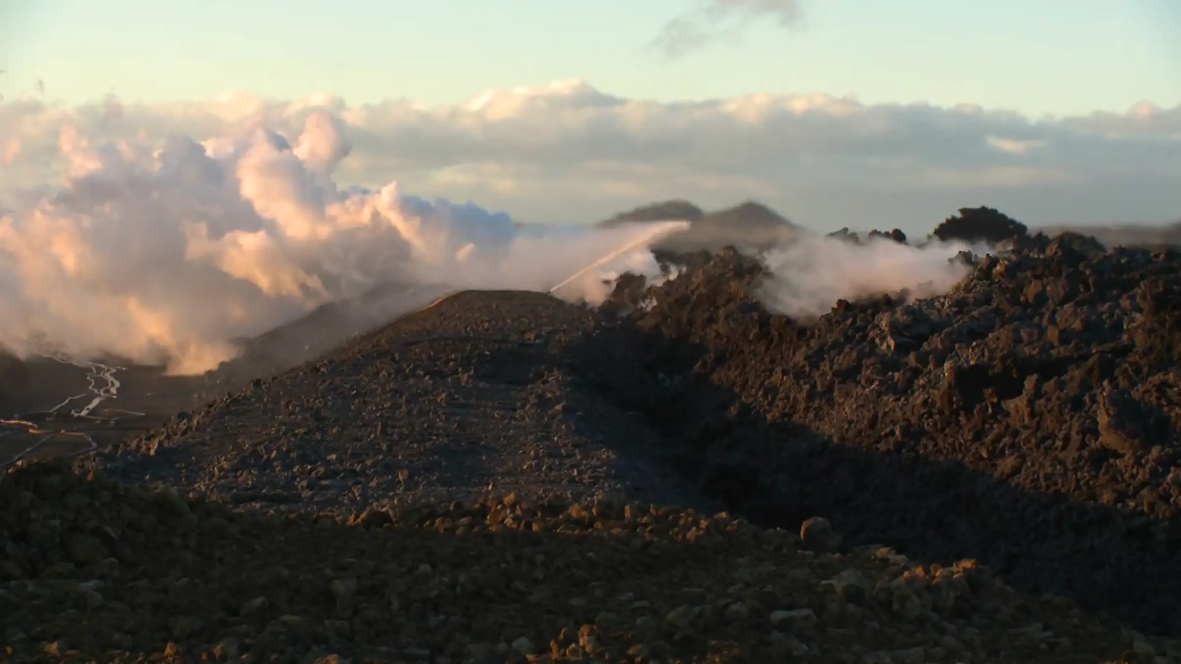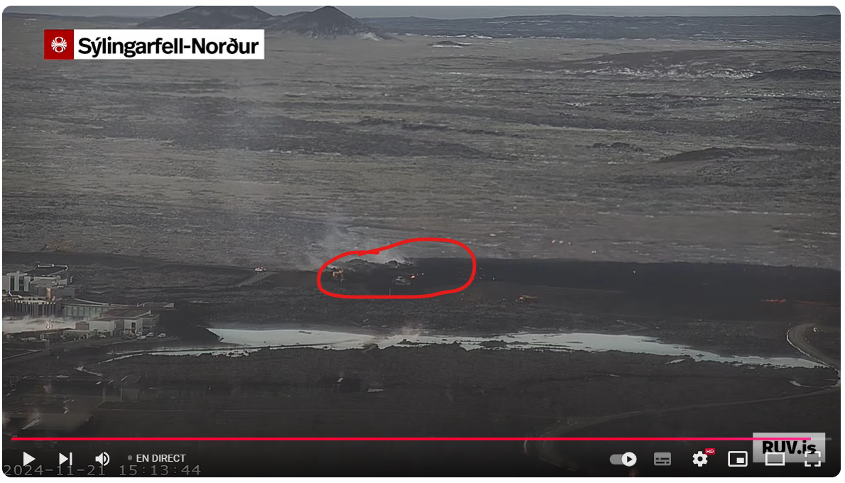 Juste derrière l'équipe de refroidissement, les machine arrivent pour réhaussé les fortifications de trois à quatre mètres en s'appuient sur la lave refroidie.