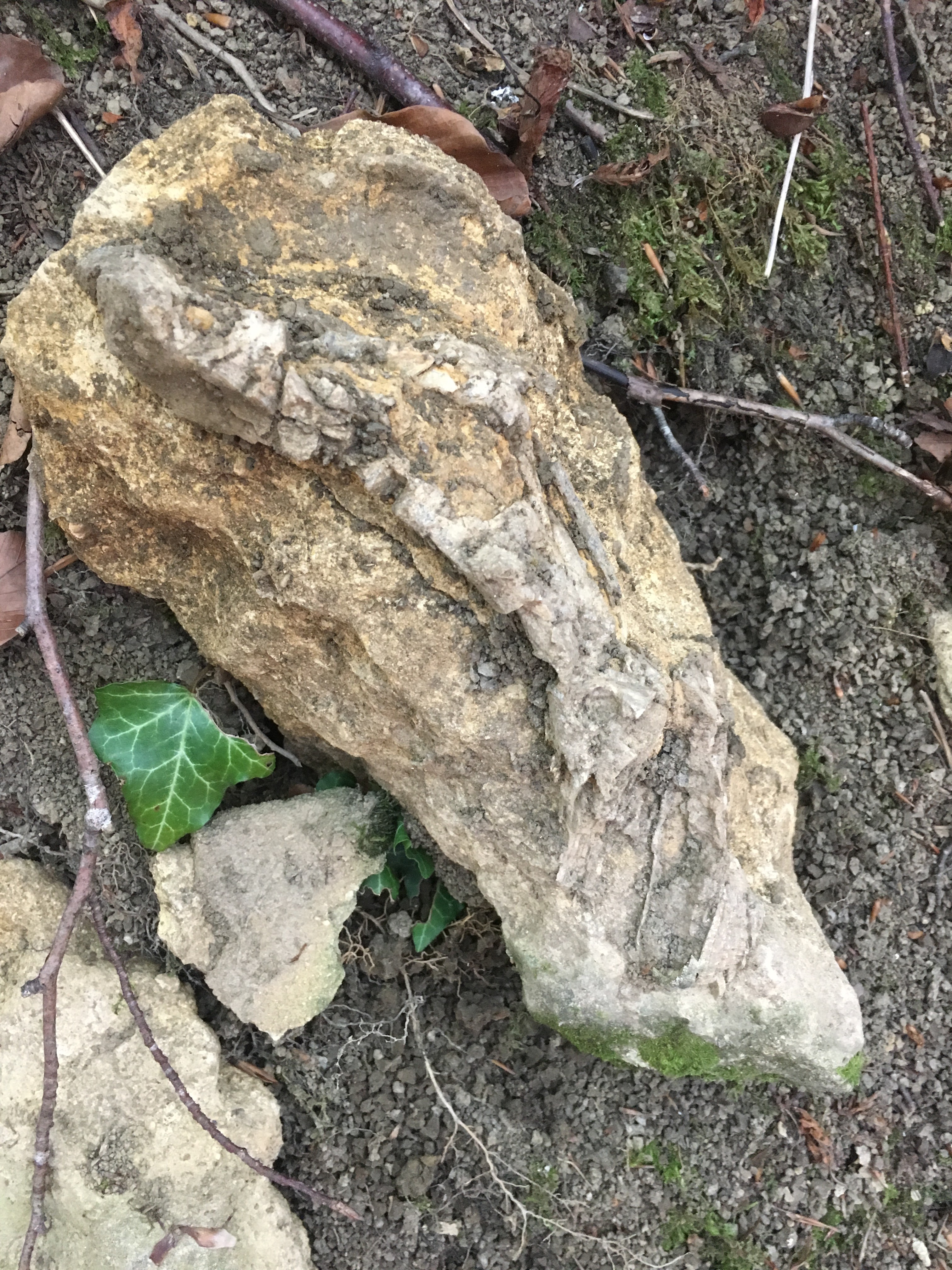 dans certains terrains du jurassique il n’est pas rare d’observer des structures fibreuses et calcifiées mais généralement fragmentaires. La première impression rappelle un madrépore, mais il s'agit généralement de fragment d’huîtres géantes (Deltoideum ?) à coquilles épaisses (jusqu’à 3,0 cm) mais fragiles du fait d’une structure columnaire. Deltoideum est présente, à priori du Callovien etjusqu’au Kimméridgien.