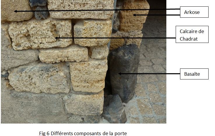 Le village se trouve à 24km de Monpeyroux , déjà trop loin pour monter une importante quantité d’arkose par cette vallée. On a préféré utiliser des matériaux plus locaux. De fait elle est principalement constituée de trachy andésite claire mais on y trouve aussi des tufs basaltiques surtout dans les parties hautes (fig 11-12-13).