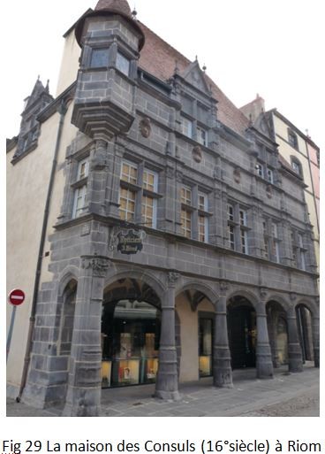 L’Eglise St Amable de Riom (démarrage 3° quart du 12°), la cathédrale de Clermont (13°)(fig 28) et toutes les constructions visibles dans le vieux quartier de Montferrand ou de Riom (15° et 16°)(fig 29) sont bâties avec ce matériau. On la retrouve un peu partout dans la région au niveau des encadrements des ouvertures des bâtiments anciens.