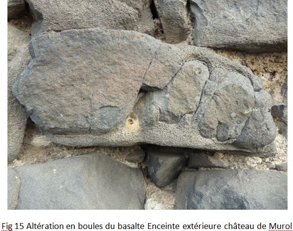 L’enceinte extérieure est constituée de blocs de basalte aphyrique. Certains montrent des altérations en boules. Les parties altérées, graineuses, se sont formées à l’occasion de fissures (fig 15).