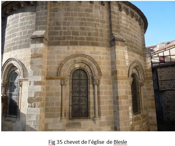 A Blesle, la partie la plus ancienne, le transept du 11° siècle, est principalement traité en blocage de gneiss local. Le chevet du 12° siècle a été traité tout différemment. Bien qu’à 18 km de Beaumont, toute la base jusqu’au dessus des fenêtres est en arkose. Au dessus une roche volcanique grise remplace l’arkose (fig 35). Pas assez sombre pour un basalte. Une possibilité est une coulée d’hawaiite qui passe vers Lubilhac à 16 km de Blesle.