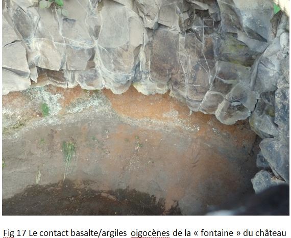 On repère facilement les pointements de basalte en place dans les murailles et le glacis (surfaces inclinées constituées de blocs de pierre qui entourent la base du châteu). Au pied du glacis se trouve une petite construction équipée d’une grille. C’est le « puits » ou la « fontaine » qui alimentait le village qui s’étendait entre le glacis et l’enceinte extérieure (fig 16). A l’intérieur on constate qu’on est en fait au contact du basalte sur les argiles oligocènes (fig 17). Cette fontaine n’est donc qu’une vasque dans laquelle s’égoutte l’eau qui aura traversé le chicot basaltique.