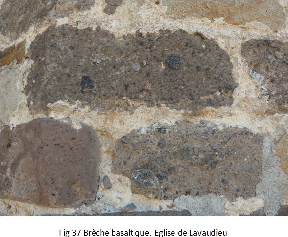 A Lavaudieu, bien qu’à seulement 14 km de Beaumont, pas trace d’arkose : rien que de la brèche probablement extraite à Senéze du côté du Pie de Charenty distant de 6,5 km (fig 36 et 37).