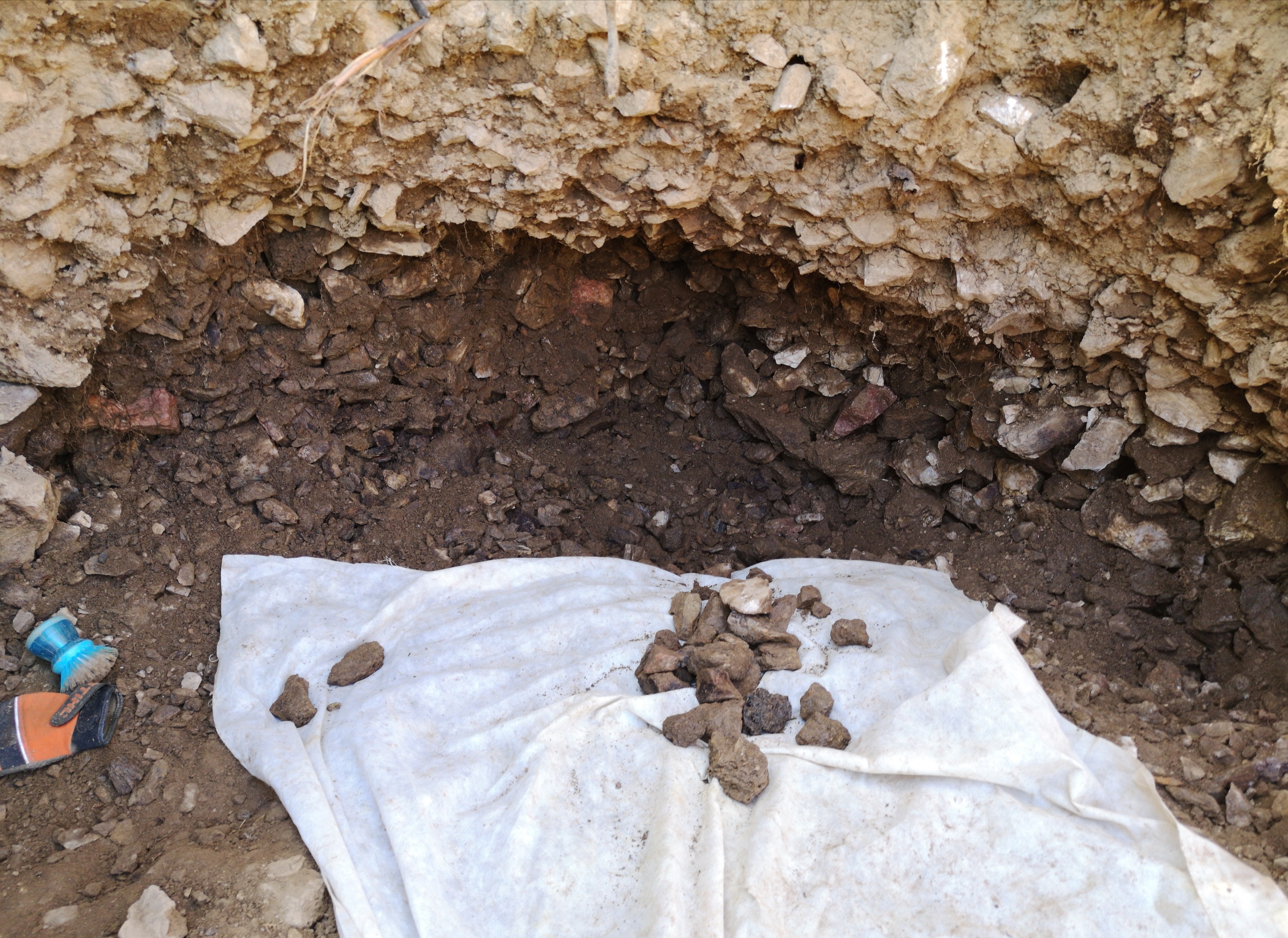Pourquoi, j'evacue le plafond à risque pour revenir droit au niveau d'où on avait fini de gratter la veille, comme ça quand le petit arrive tout est droit est on peut fouiller directement au niveau des trouvaille et pas dans le sol de surface très pauvre lui.