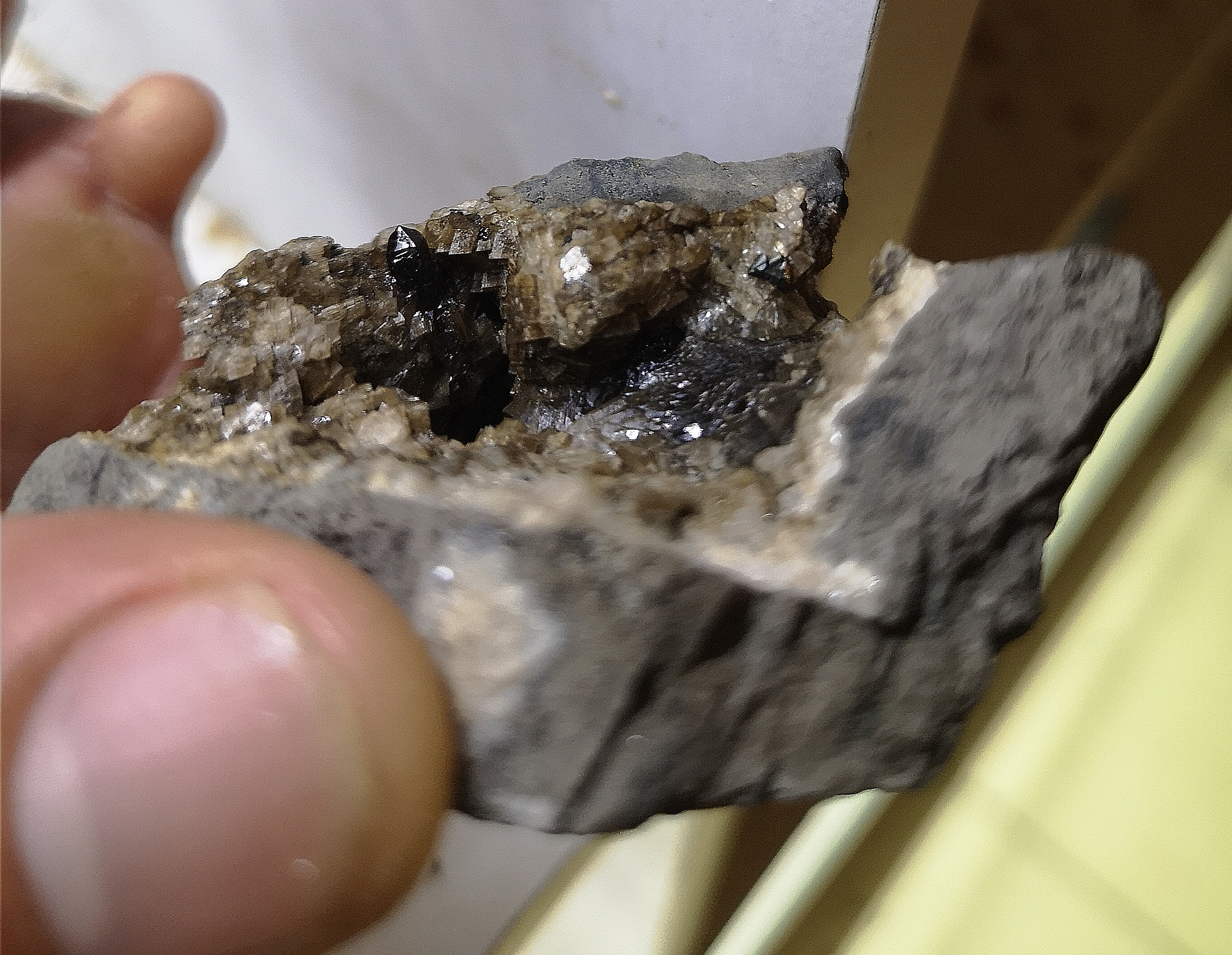 Puis nous sommes rejoint par Bruno et Alex 2 jeunes fort sympathique aussi. Et la en nettoyant une pièce dans le sceau d'essence je tombe sur une dolomite blanche avec une tétra et de l'autre côté un tout petit quartz très noir, et qui le reste malgré le passage à l'essence, je suis trop content la matinée est riche en découvertes.