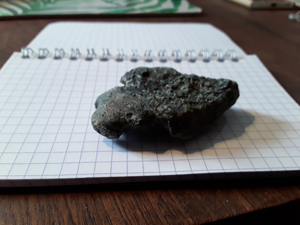La seconde est une roche grise,rouille et verte scintillante à la lumière, elle pèse 177gr,ses dimensions sont:-65×55×30mm.celle-ci est ferreuse donc s'aimante.
