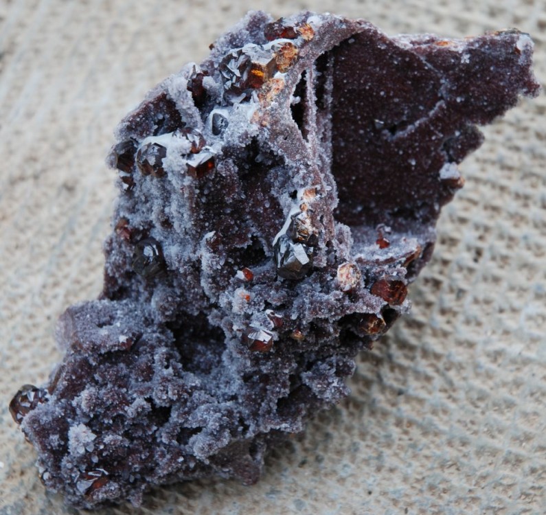Je vous joins une photo (que j'ai faite grace à l'ami Alain, qui se reconnaitra, car il m'a cédé le specimen: rhodocrosite, calcite, galene et marmatite dans une stalactite de 5 cm de diamètre. La plus belle pièce de ma collec.