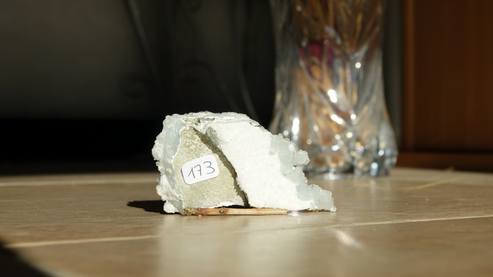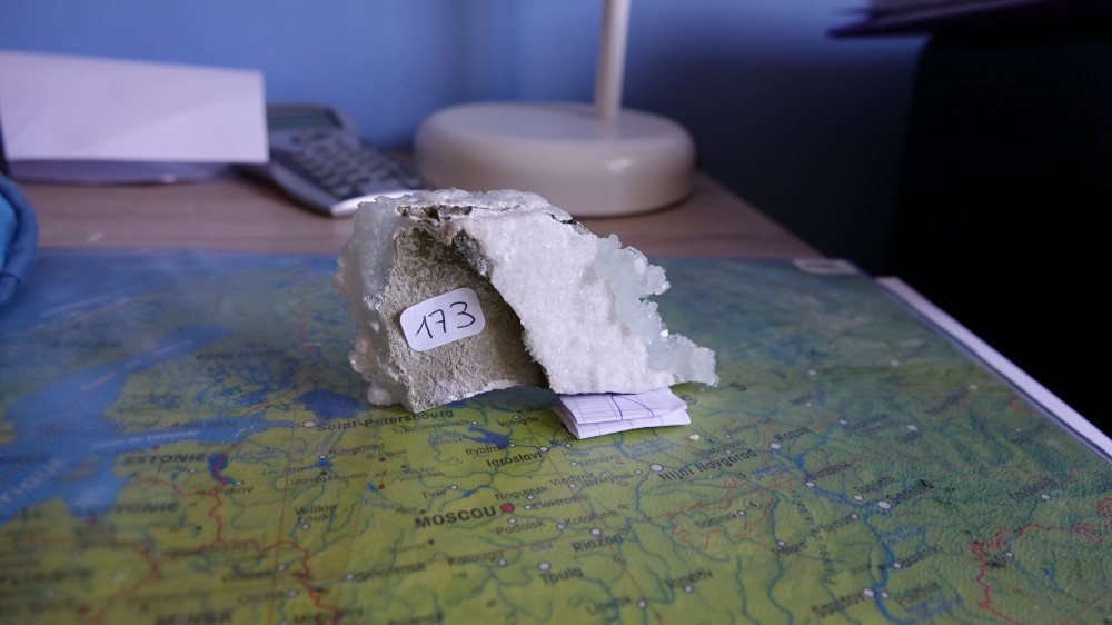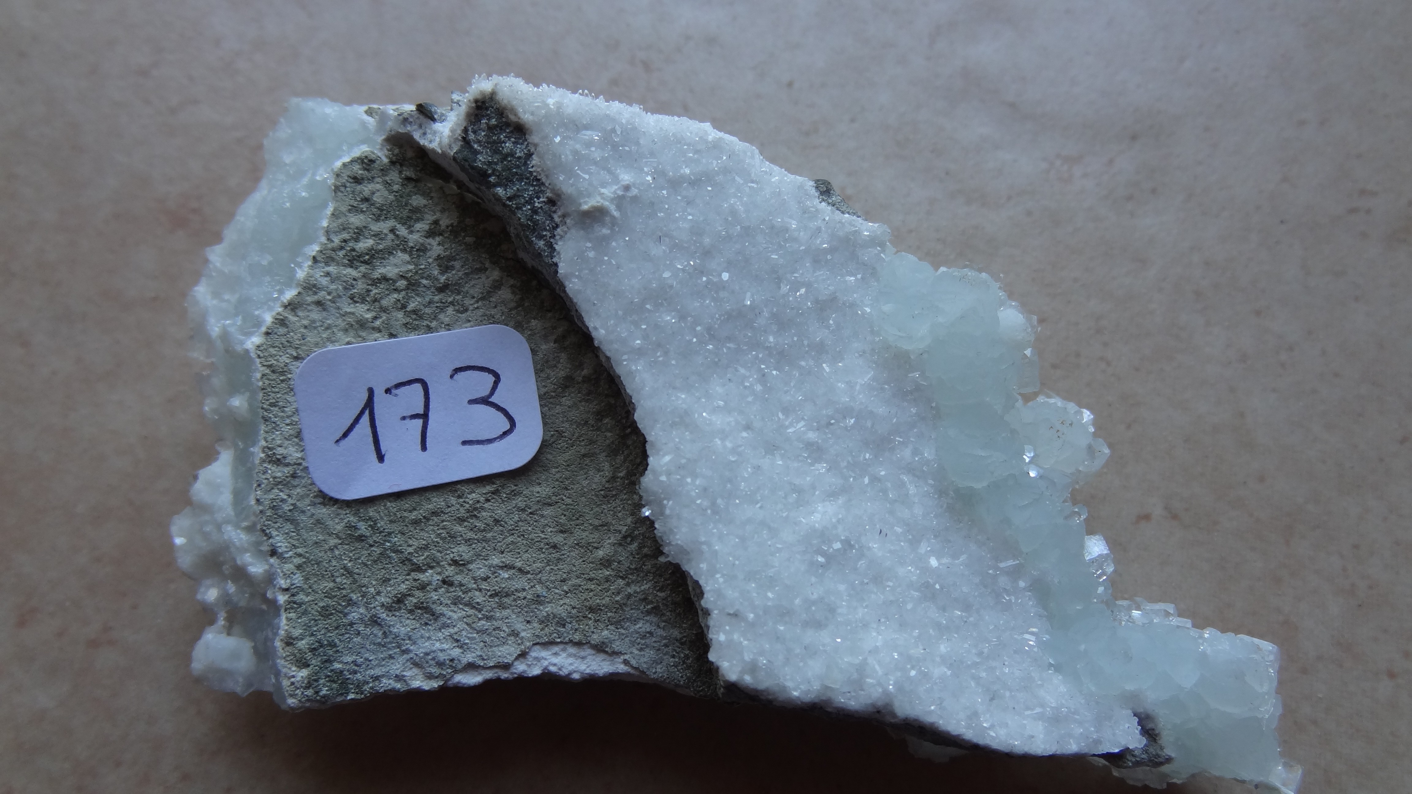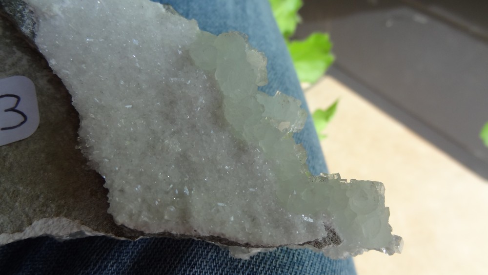 Le problème c'est la couleur des cristaux, s'il y a réellement de la prehnite, on arrive pas à faire la distinction entre les deux, là je ne vois rien.