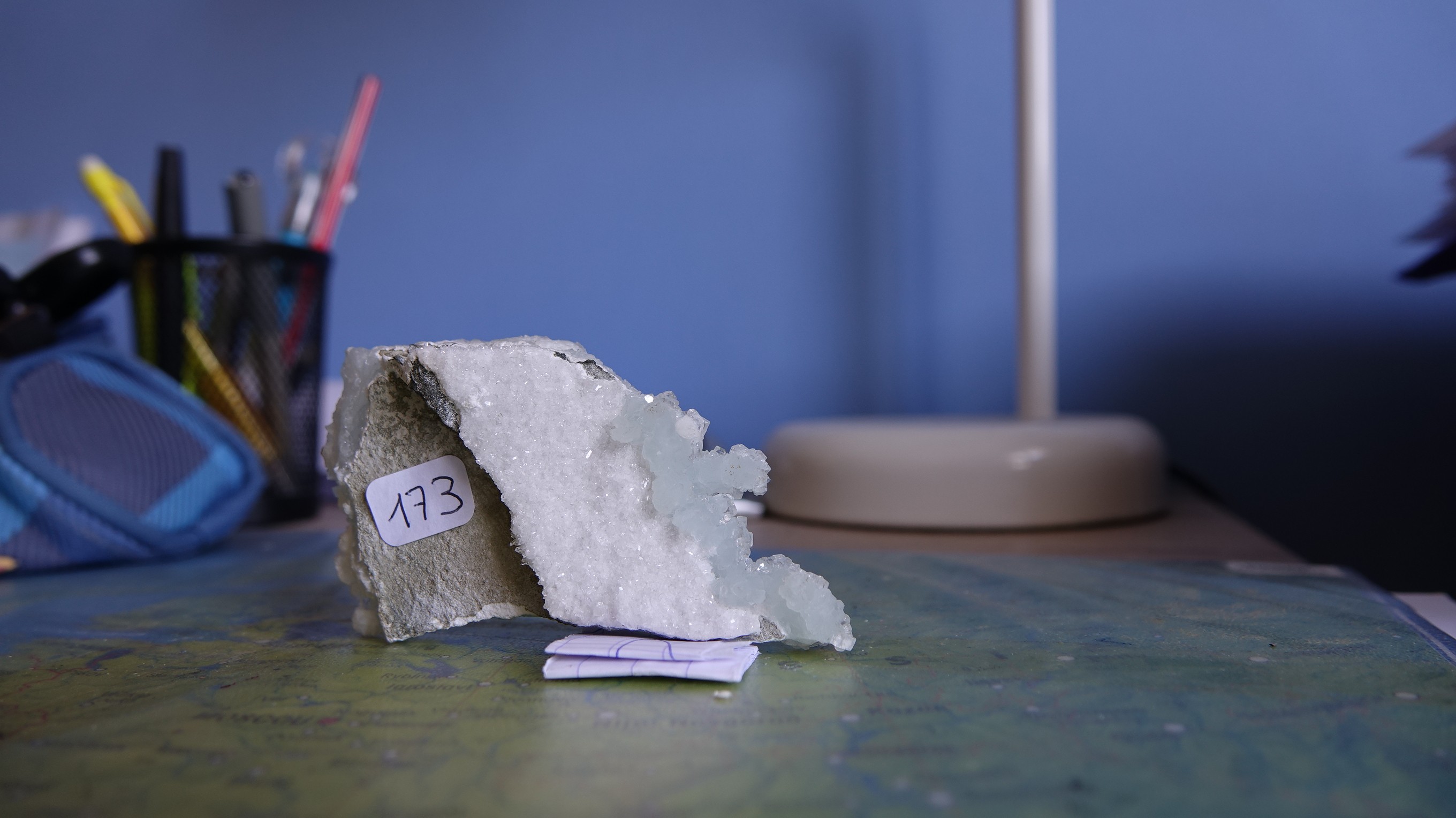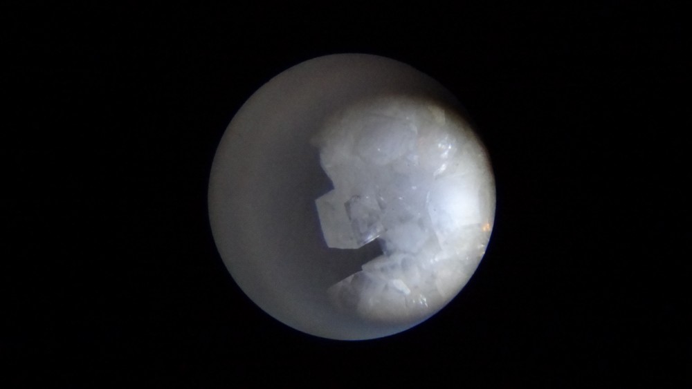 ce que tu as pris en photo à travers ta bino semble plus être une apophyllite, ne peut tu pas essayer de prendre ton truc inconnu de la même façon ?