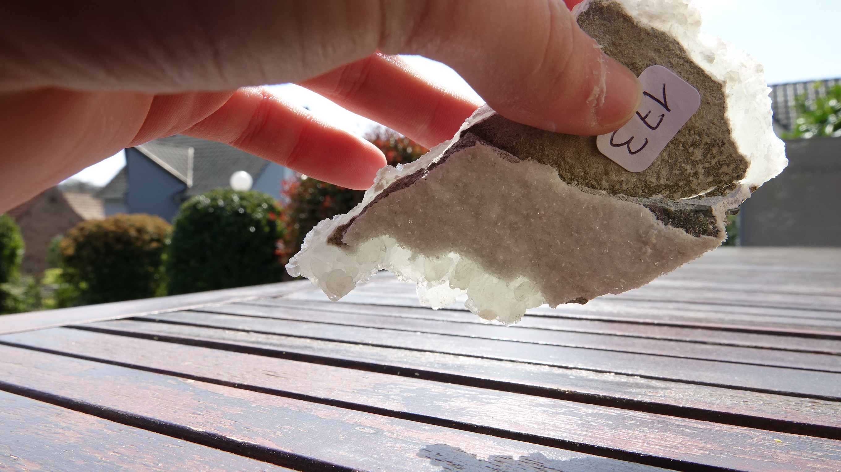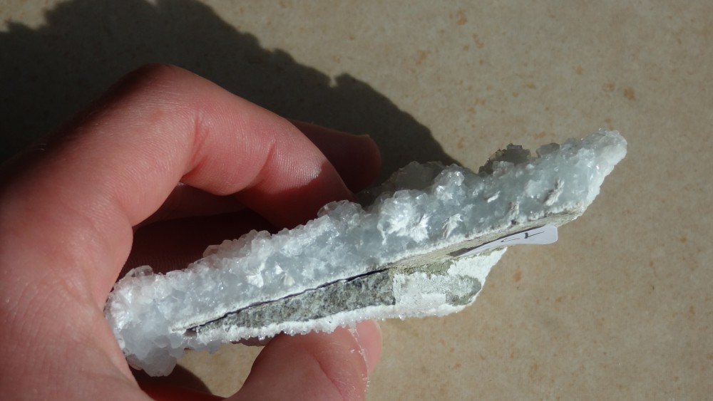J'ai remarqué sur a tranche de la pièce des traces plus marquantes (de zéolithes je pense) ainsi que la où se trouvent les cristaux que l'on essaye d'identifier.