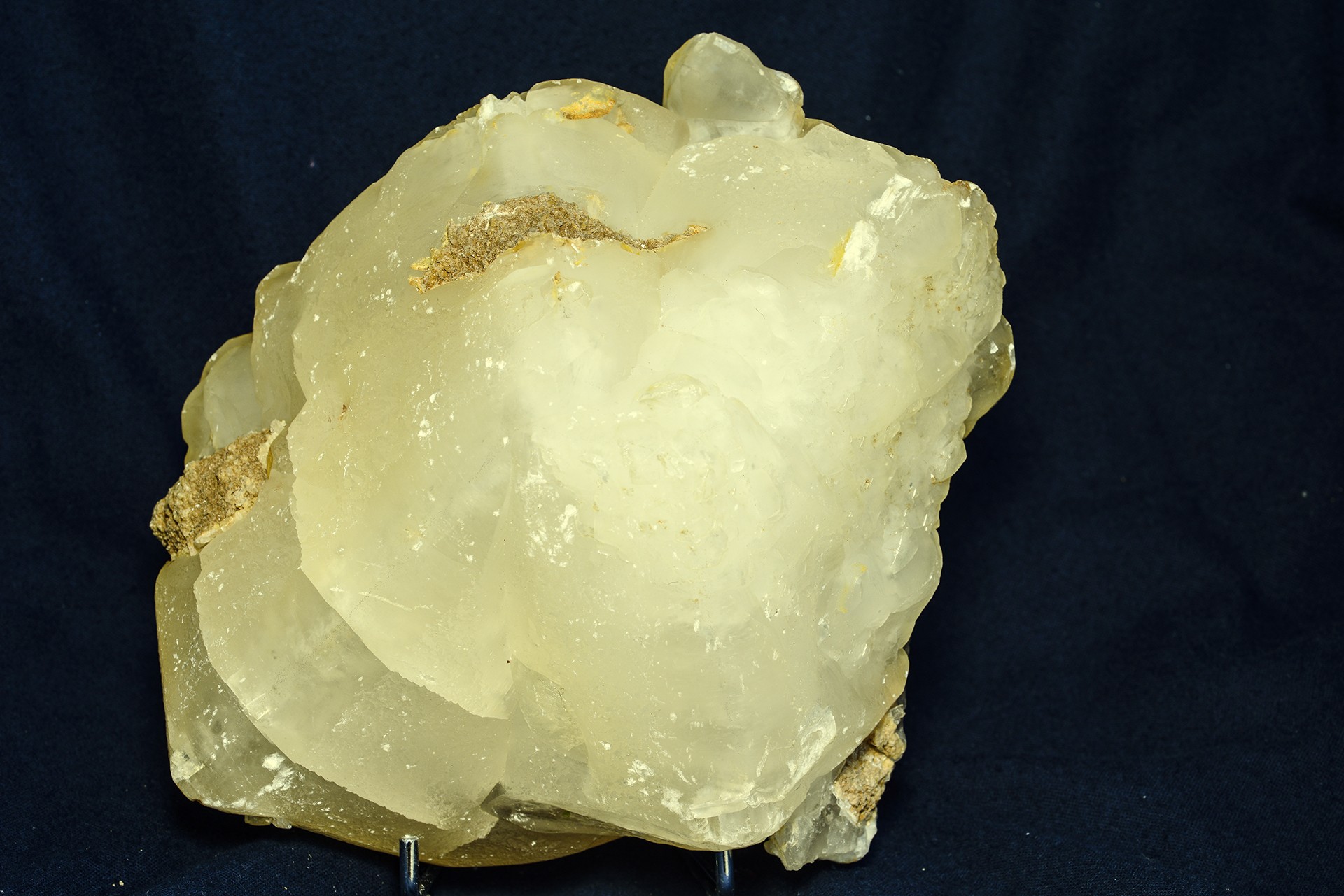 c'est un cristal presque flottant ;  à l'arrière, juste un petit indice de son support : carbonate peut-être car ça ne raye pas mon couteau, couleur limonite, friable, peut-être ankérite... Les cristaux de calcite sont terminés et plus clair qu'à l'avant. La pièce pèse 2 kg 460. Voici une photo de l'arrière de la pièce