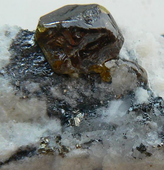 sphalerite , pyrite et un cuivre gris (bournonite ou tetraedrite massive ?) sur quartz ( ya peut etre un piege , ça me parais facile!!)
