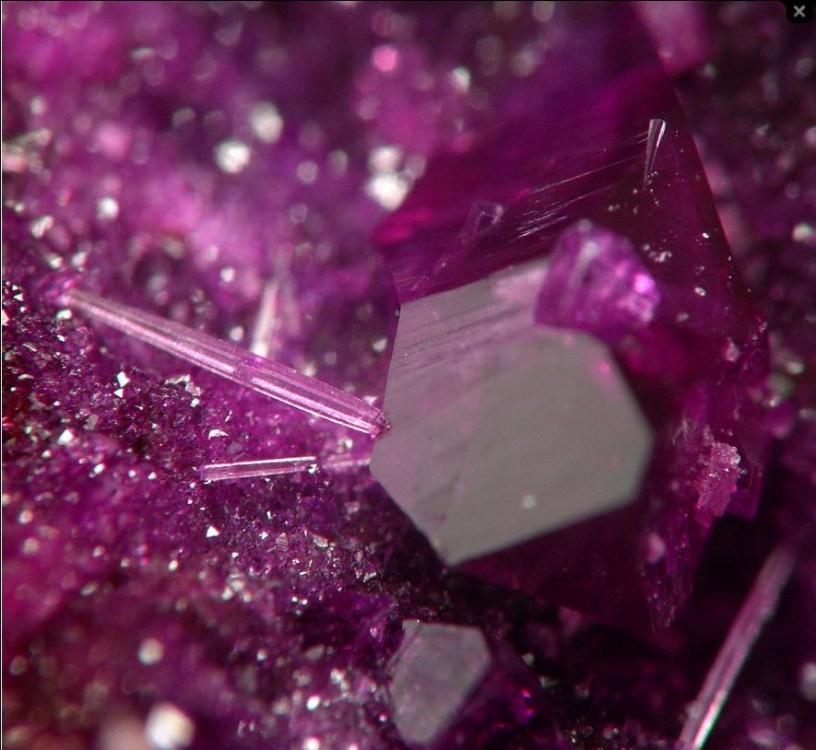 Les cristaux violets ne sont ni crocoïte ni kammärerite mais évoquent furieusement l'érythrine, avec une gangue à éclat métallique évoquant des sulfosels de Co genre skutterudite ou cobaltite.