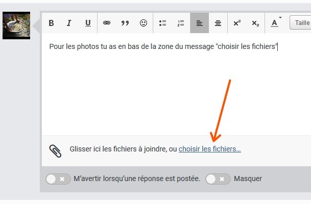 Pour  insérer la photo depuis votre appareil, c’est le trombone en bas à gauche du texte à publier