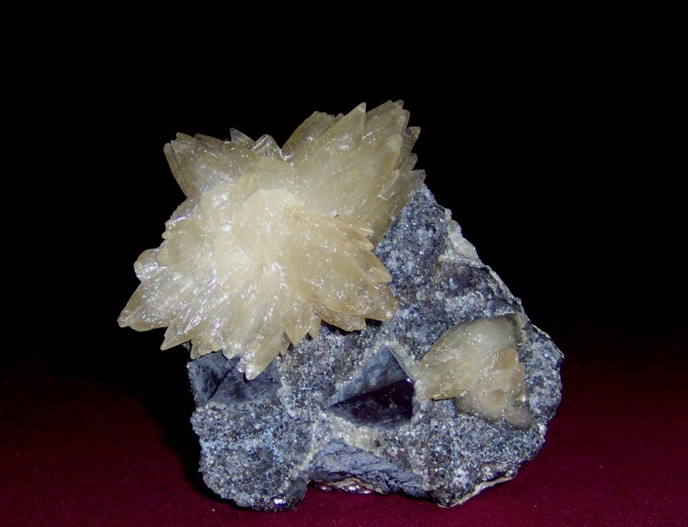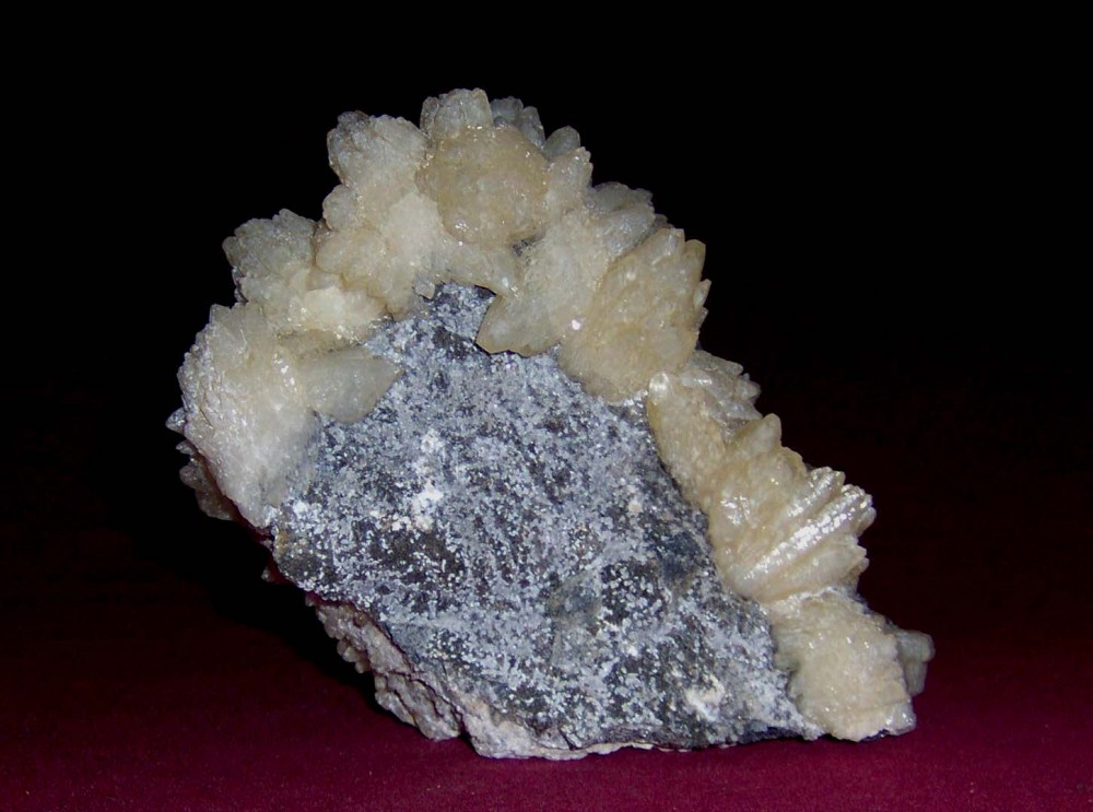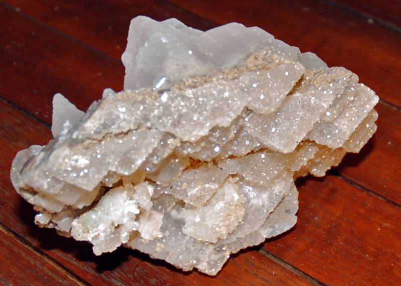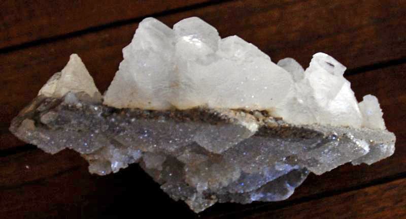 La lame qui supporte les 2 types de cristallisation est faîte de calcile massive, dont le décallage en marches d'escaliers a permi la croissance de séries de rhomboèdres alignés.