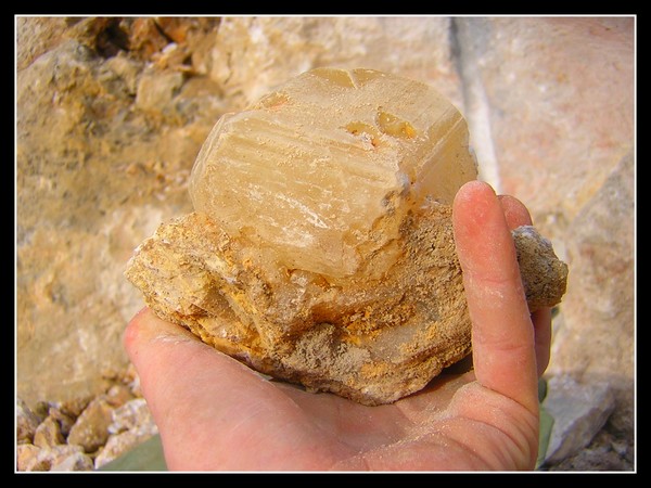 Prospection d'hier : calcite (2 générations, blanche et miel) et chalcopyrite, Ambohidratrimo, Madagascar.