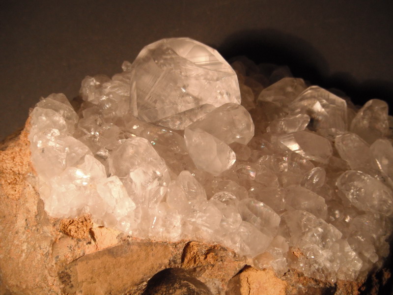 Assemblage de prismes de calcite "gemme", sur lit de sidérite, avec quelques cubes de galène et de marmatite. Ca vient du Tarn.