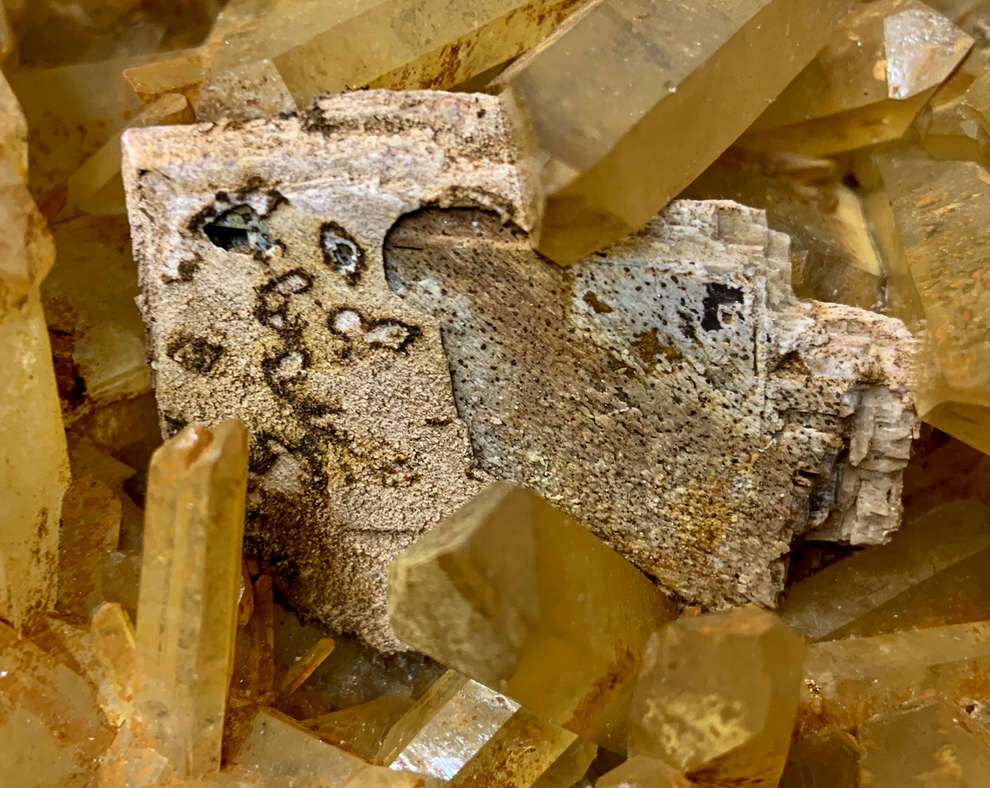 La trilogie de LG Quartz, habitus dauphiné, Barytine en cristaux rugueux formant une rose, Chalcopyrite en sphénoèdre légérement altéré [90mm]
