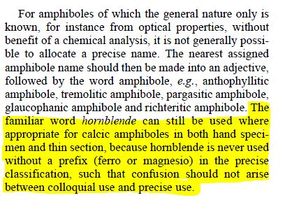 (...) Quand au mot hornblende, et bien l'IMA accepte son emploi pour les amphiboles calciques, et pour le sens strict on met un préfixe.