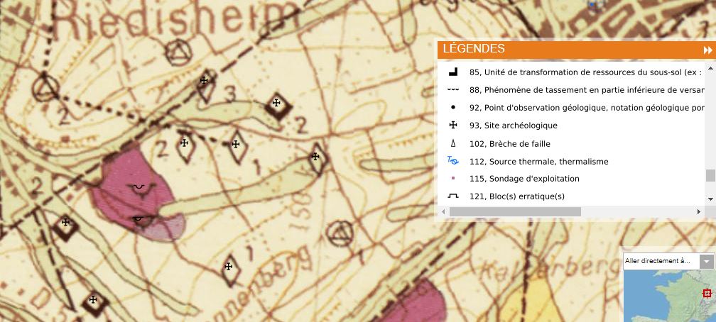 Merci pour les infos précises pour avoir la légende des symboles, mes recherches vont encore aller plus vite! Car pour l'instant je fonctionnais avec le losange + diminution de la transparence du 1/50000 BRGM pour savoir si il y avait une ancienne mine/carrière proche du losange. Avec la légende, ca va être top!