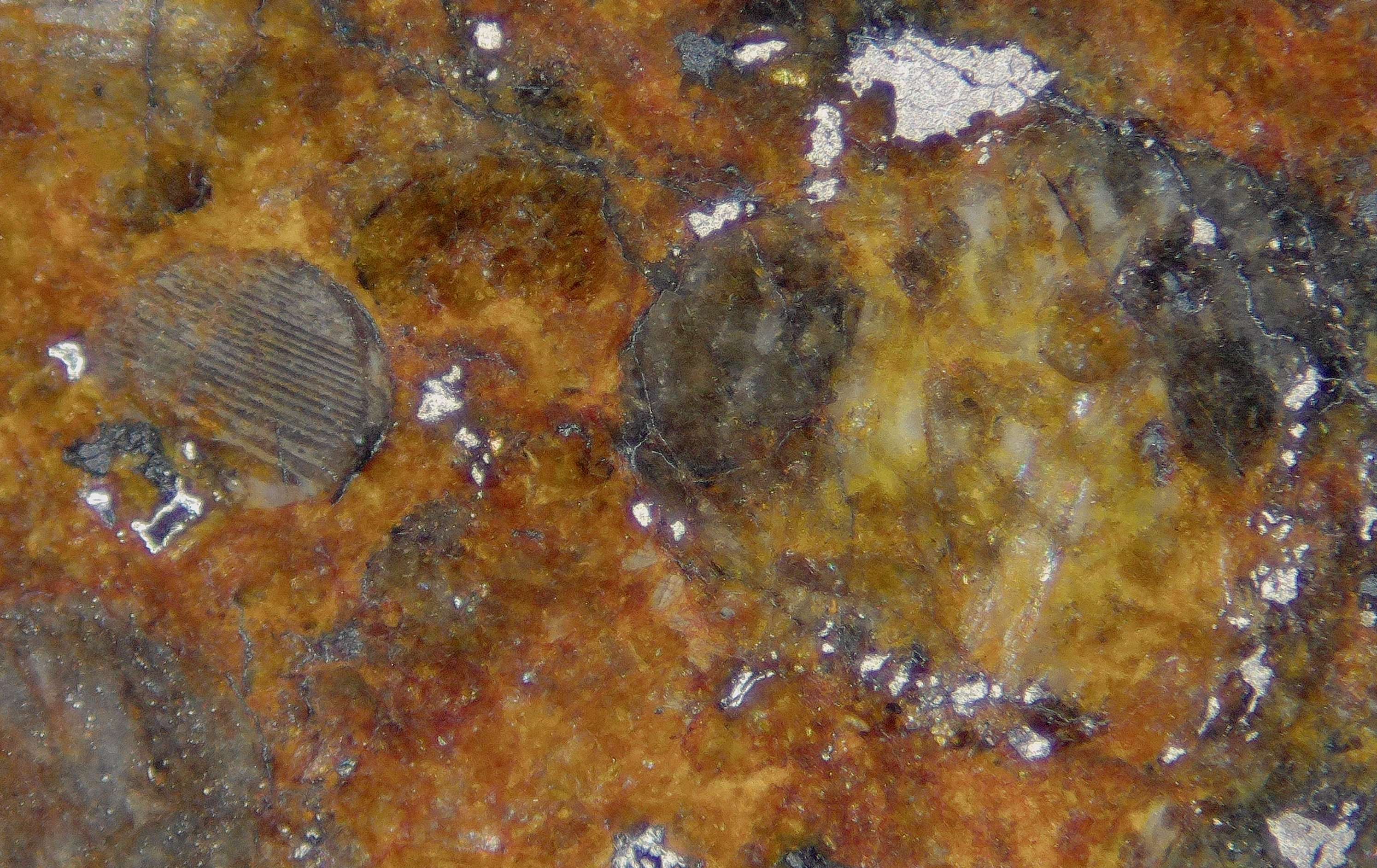 Voici une météorite bien bizarre comme je les aime (pas en lame mince, mais dans ma collec' aussi), en lumière naturelle: la bencubbinite Gujba et ses chondres géants, dont une bonne part sont 100 % métalliques: