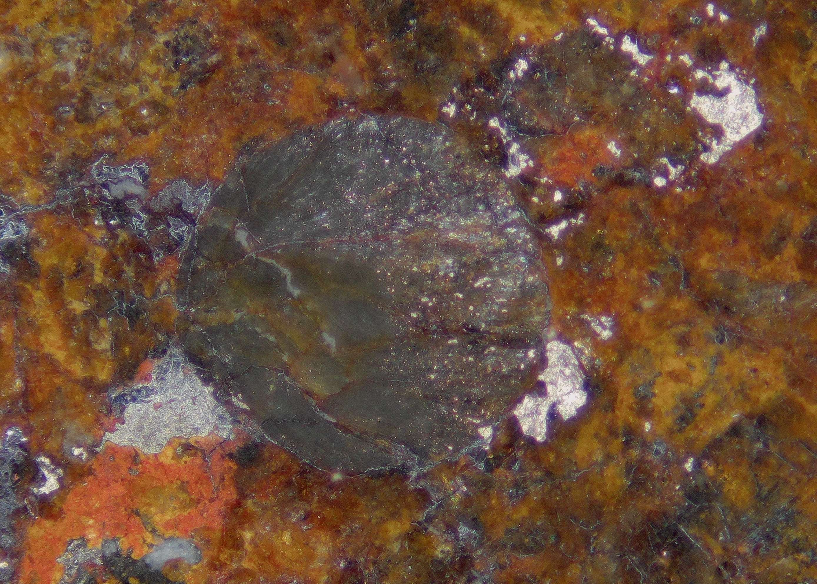Un chondre semble montrer une structure granulaire ? en haut à gauche de la photo.