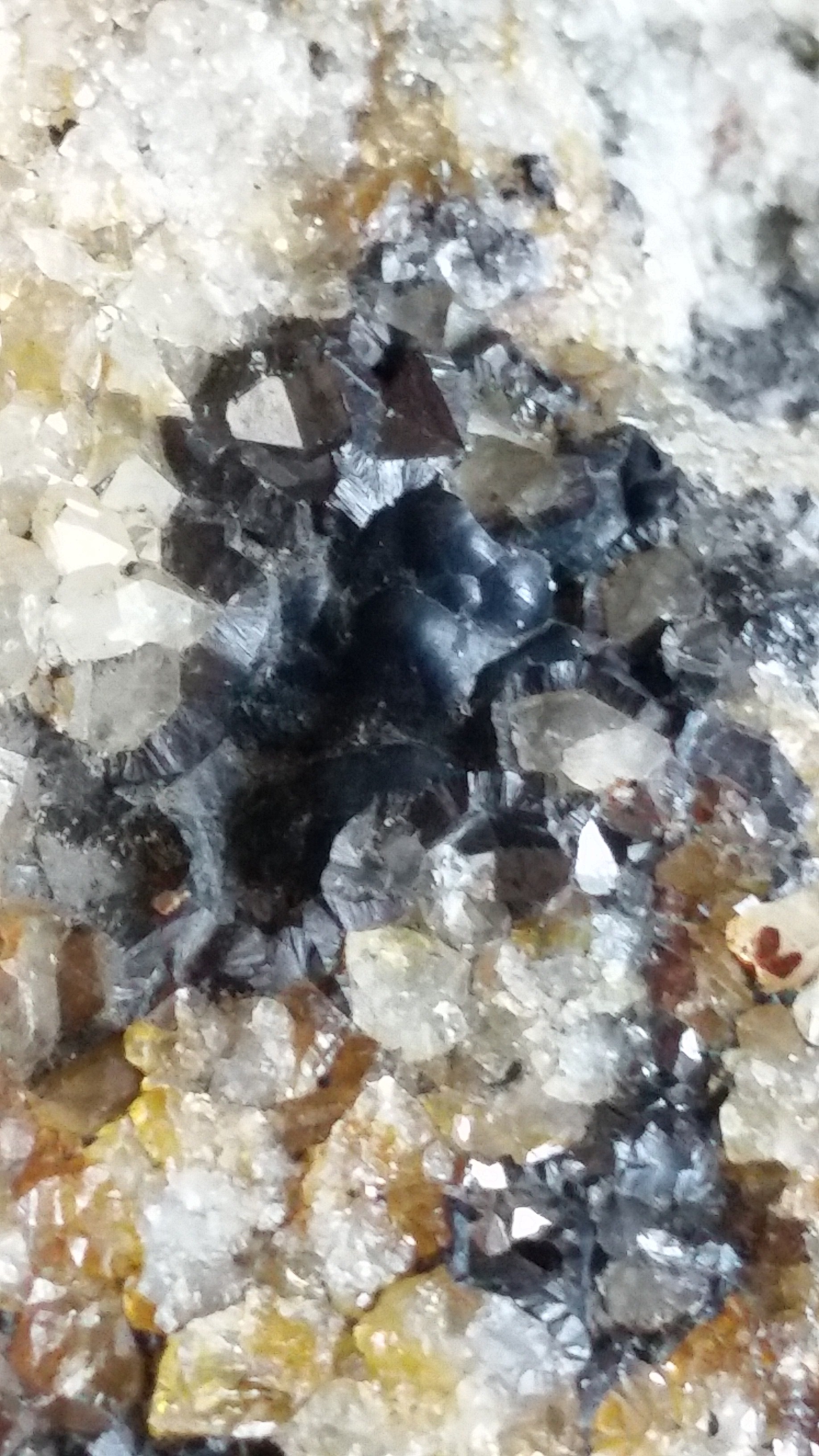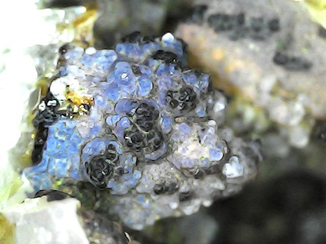 j'ai trouvé des blocs de quartz avec ce minéral qui ce développe sur les cristaux de quartz. Mais de couleur bleu, blanc....  j'hésite, je pensais que la goethite était uniquement noir, brun/jaune. Trouvé sur le secteur de Dambach la ville (Alsace)