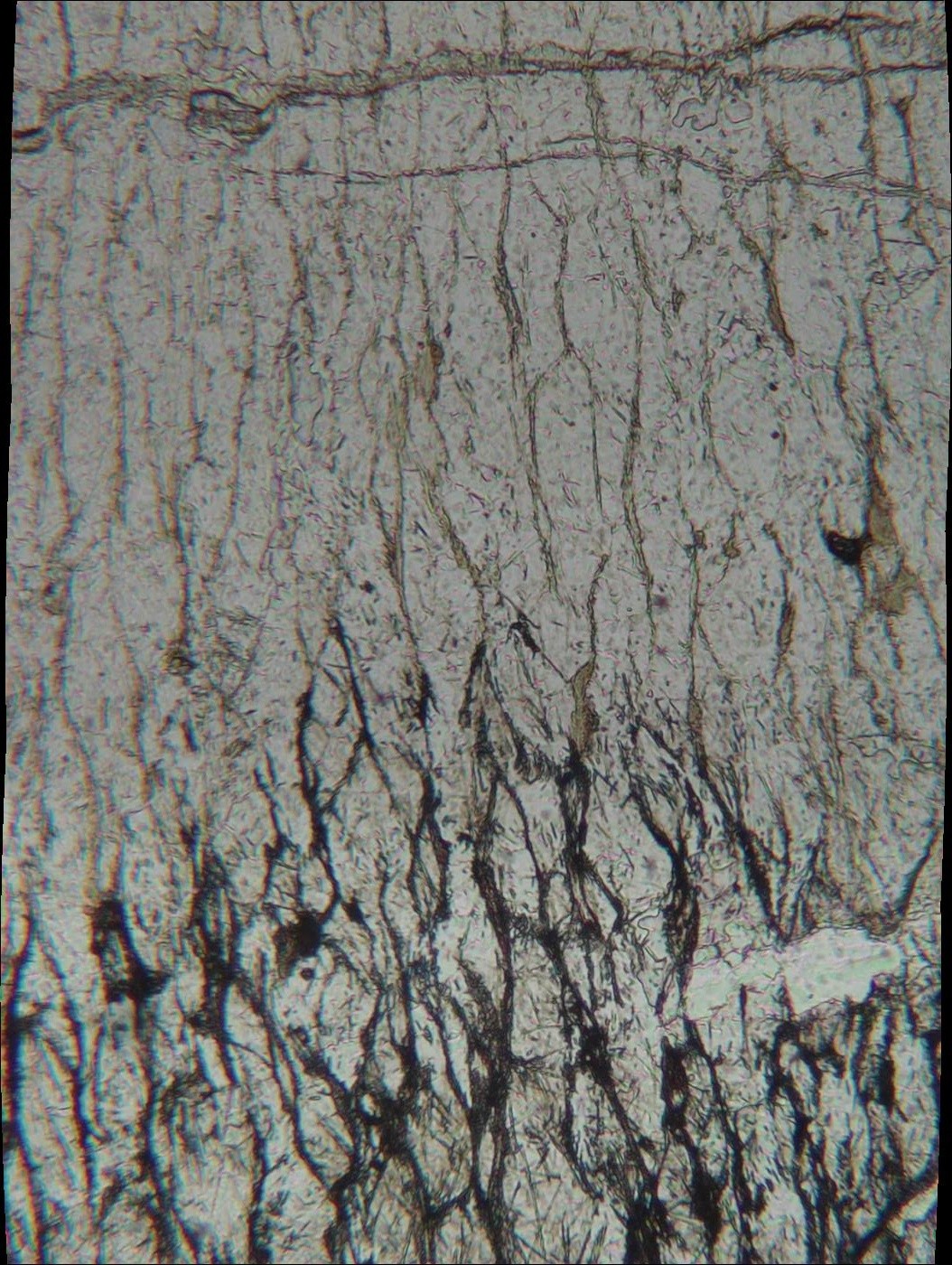 Par ailleurs, on voit ces débuts d'altération dans des microfissures, qui ont l'air bien phylliteuses, donc la cordiérite est mon meilleur choix, ou plutôt je n'en ai pas d'autre.