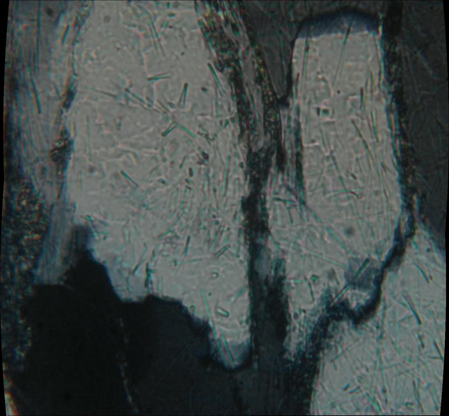 Dans la zone claire, par contre, les aiguilles incluses dans la cordiérite sont moins nombreuses, et surtout celles qui sont dans les joints de grain ont disparu, remplacées par des petits micas (plus pléochroïques, mais ce n'est pas hyper visible sur la photo)