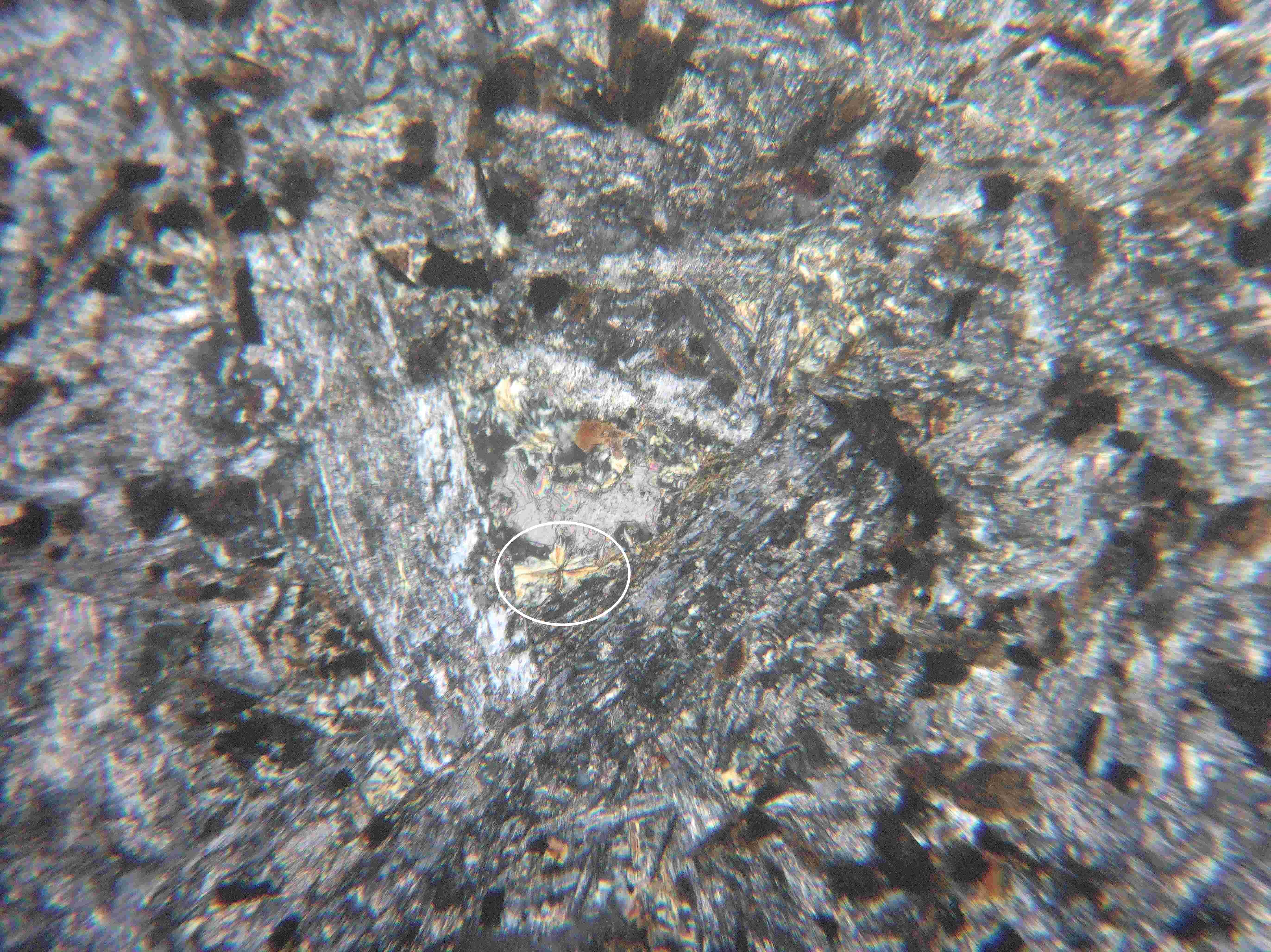 Sur la photo 3, on est peut-être dans le globule (?), et ce qui correspondrait aux petites inclusions blanches que l'on voyait dans les feldspaths ce sont peut-être les taches noires dispersées un peu partout. Pouvez-vous nous préciser avec la photo en LN si c'est vraiment isotrope ? ou si ce sont encore des opaques ?