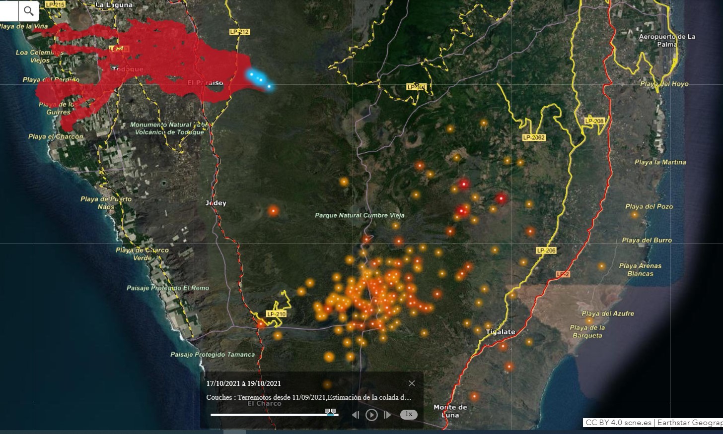 En 1949, lors d'une éruption, la moitié occidentale de l'arête de la Cumbre Vieja a glissé de plusieurs mètres vers l'Océan Atlantique. On pense que ce processus a été provoqué par la pression de l'eau, présente dans la structure de l'île, portée à ébullition par la remontée du magma.