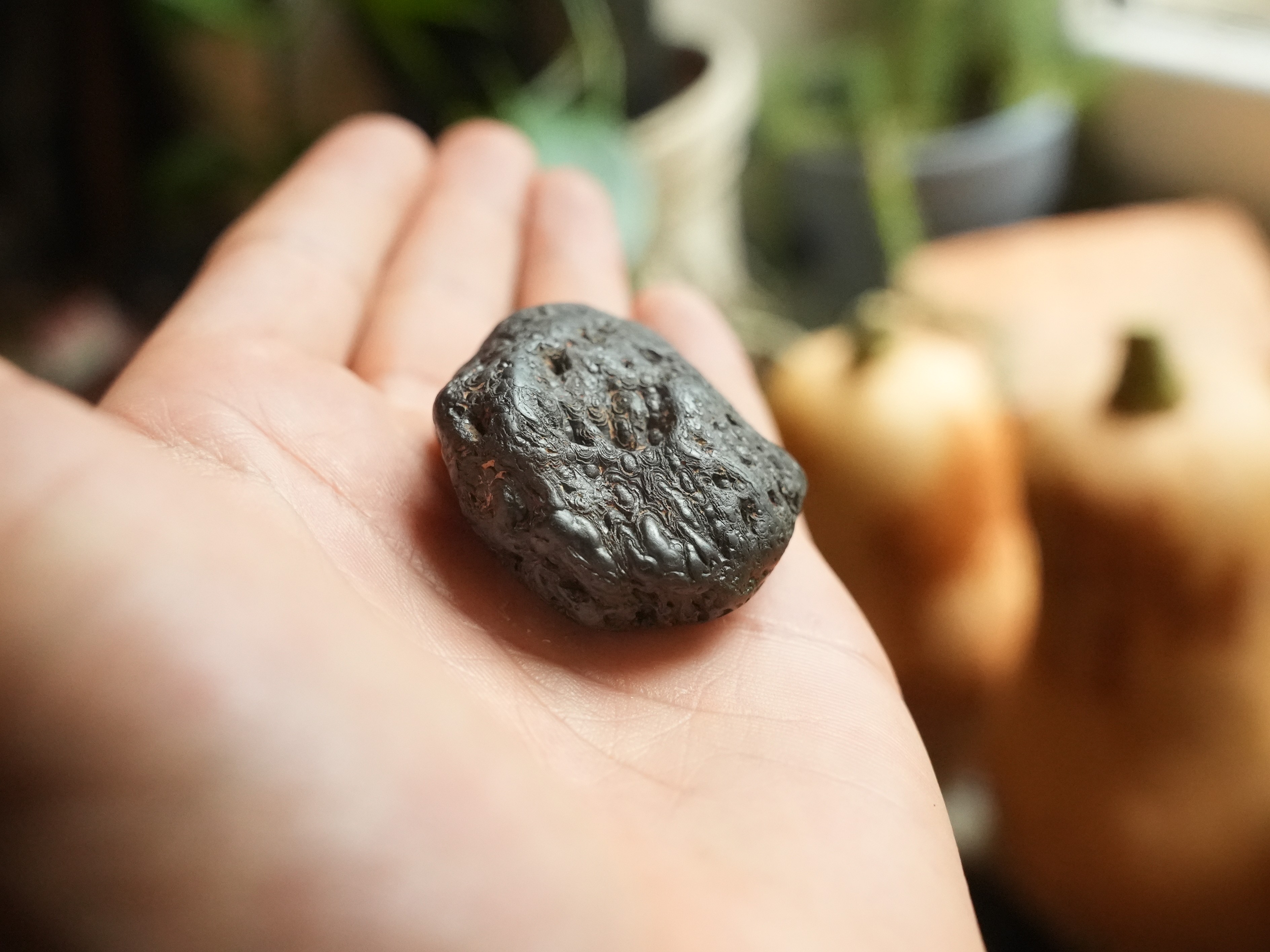 Météorite je ne pense pas, mais elle a une densité de 4.05,  ne semble pas ou très peu magnétique. Peut-être une goethite? En tout cas je la trouve très belle!