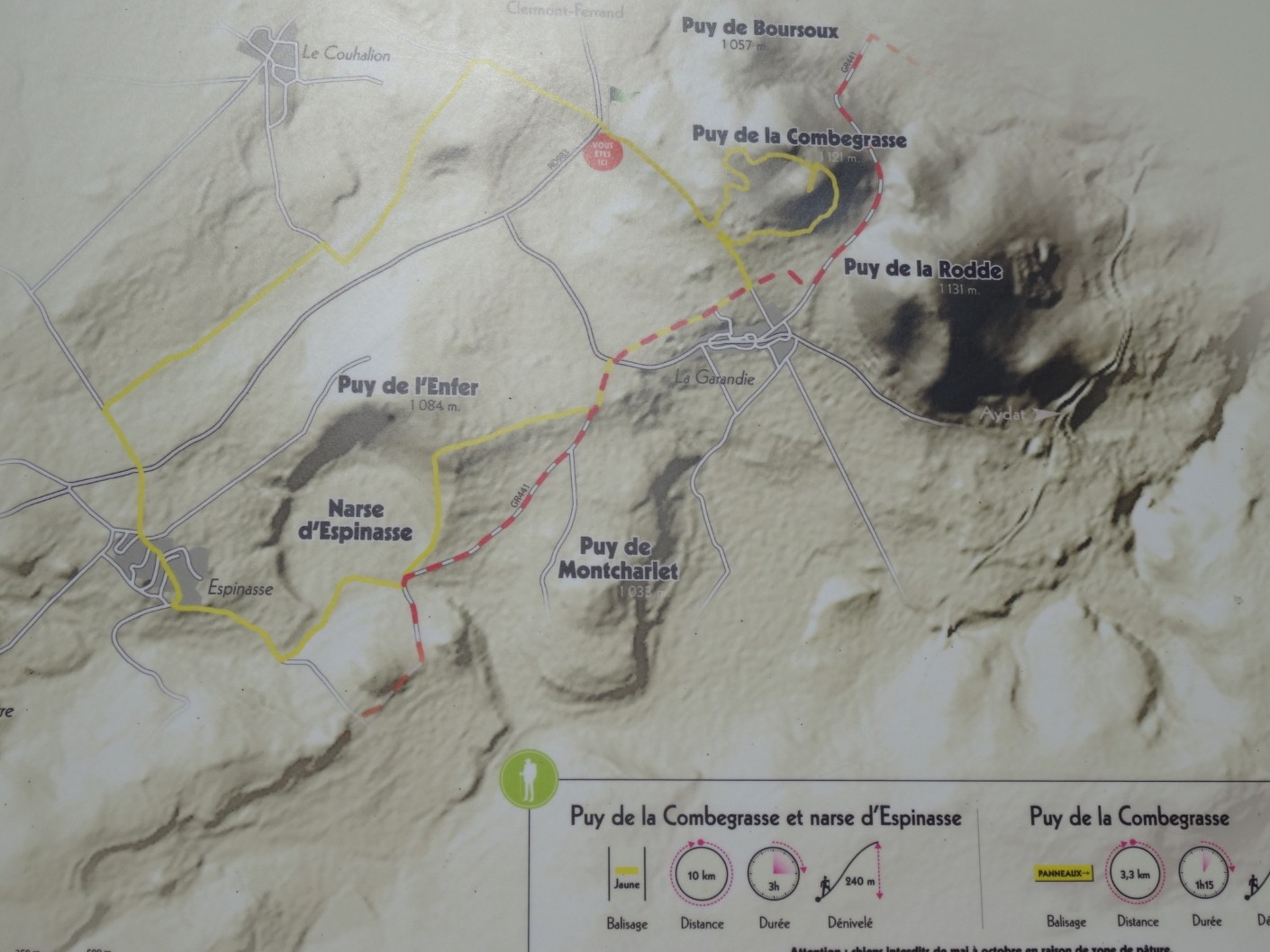 Le volcan de Combegrasse a été aménagé pour les randonneurs depuis seulement quelques années et les tables d’orientation ont déjà subi des dégradations (je ne pense pas que les intempéries y soient pour quelque chose)