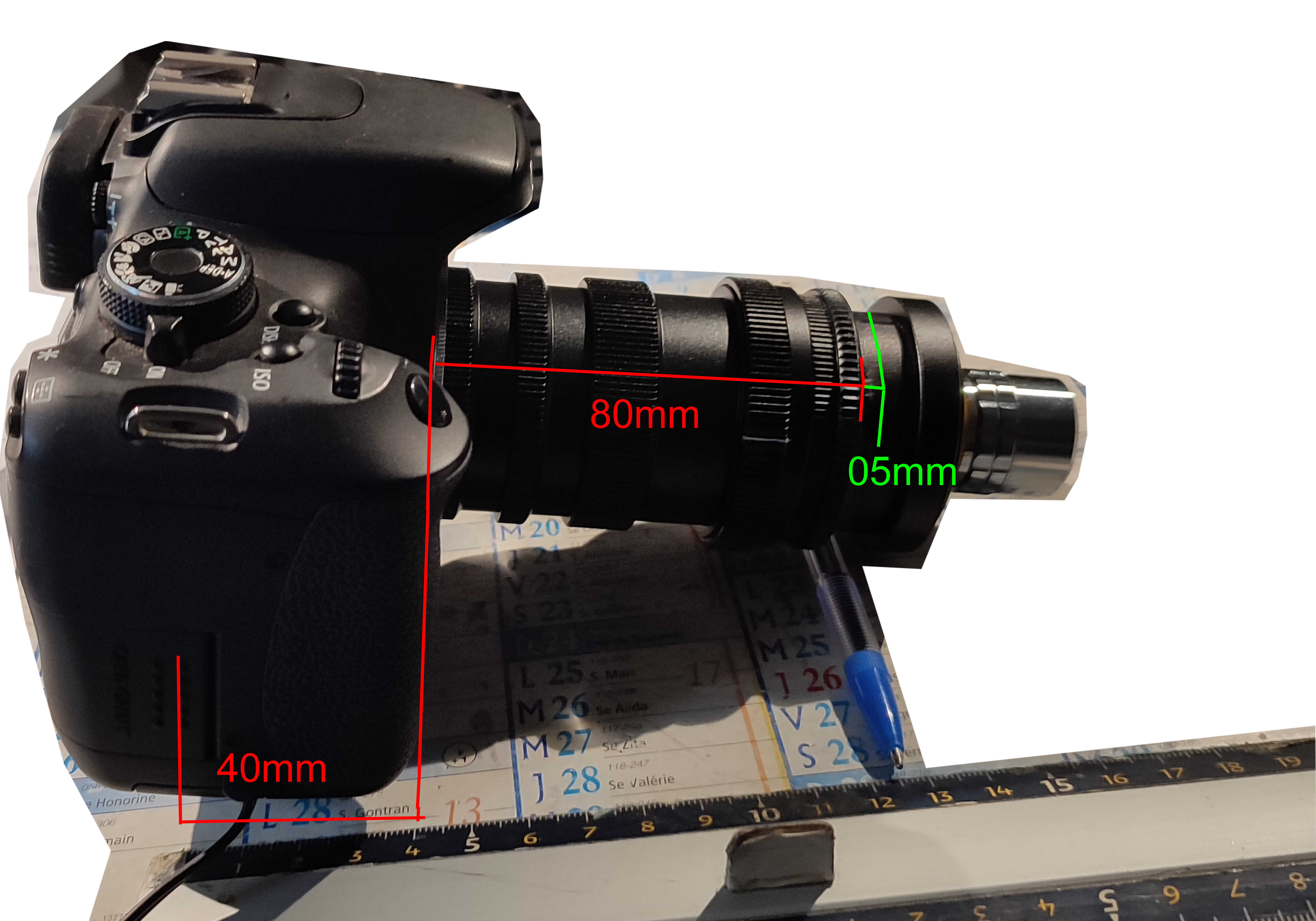 - la distance A : 80mm : soit de la bague Canon grise métal à M42 comprise à : juste avant la Raynox au niveau du crantage  (voir photo)