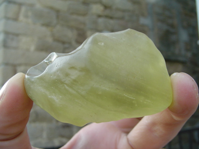 Et le plus célèbre et le plus facile à trouver en bourse notamment grâce à Mr Alain Carion: le verre libyque ou claytonite qui contrtairement à son nom ne se trouve pas en Lybie mais en Egypte, dans le désert libyque . Le pectoral de Toutankhamon possède un scarabé vert sculpté dans du verre libyque. Ce verre a été taillé pour en faire des pointes de flèches. Certains contiennent des petites boules blanches de cristobalite, d'autres montrent des "schlieren" (trainées brunes). Ces cristaux de cristobalite témoignent de très haute température et très hautre pression dues à l'impact très énergétique. Le vent du désert les a poli avec les grains de sable en formant des petites cupules. On l'a daté de 28 à 29 millions d'années.