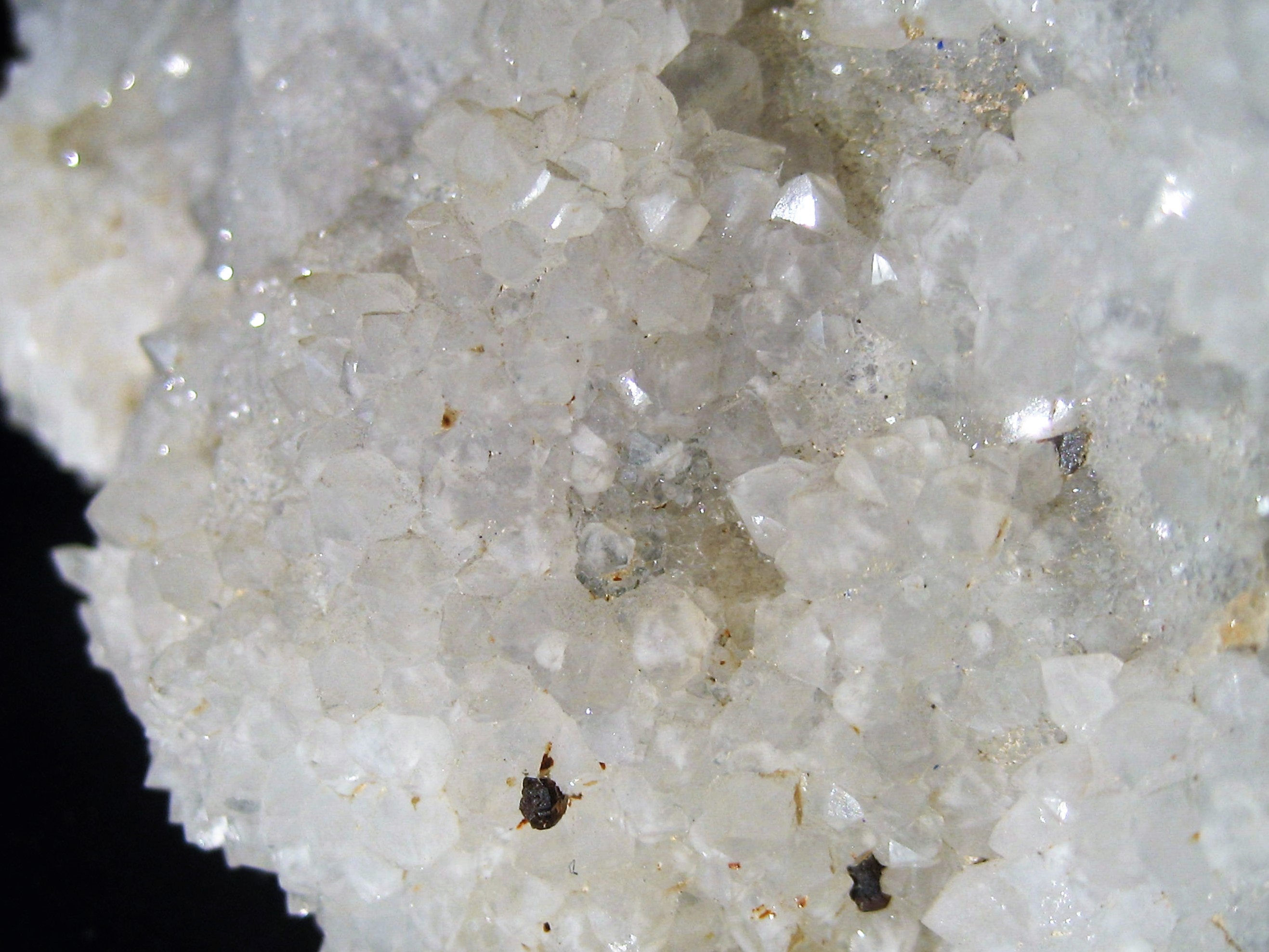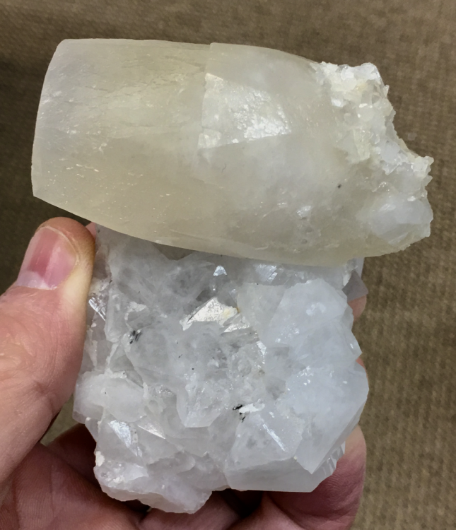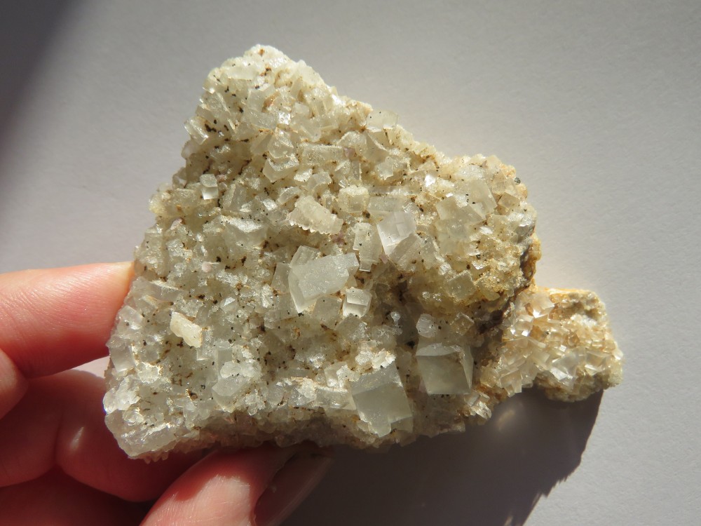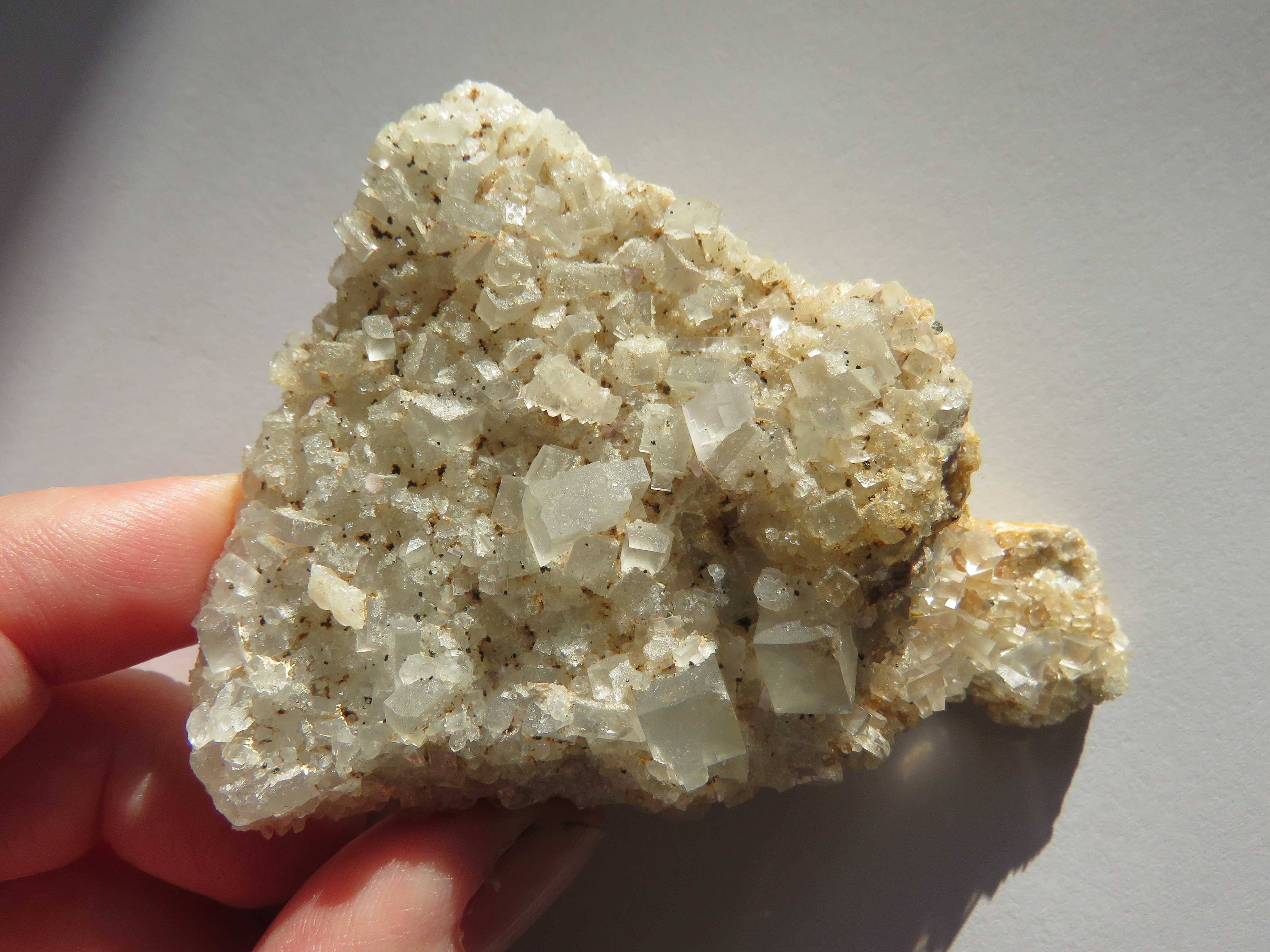 Bonjour, voici un petit exemplaire très ancien et d'origine perdue de fluorine française, dont les cristaux incolores à très légèrement verts ont tous une forme très allongée, avec saupoudrage de petits quartz.  Le cristal le plus allongé de ce spécimen mesure 8 mm de longueur pour des faces d'1 mm de large ! Pourrait-t-il s'agir d'un exemplaire de Fonsante ?