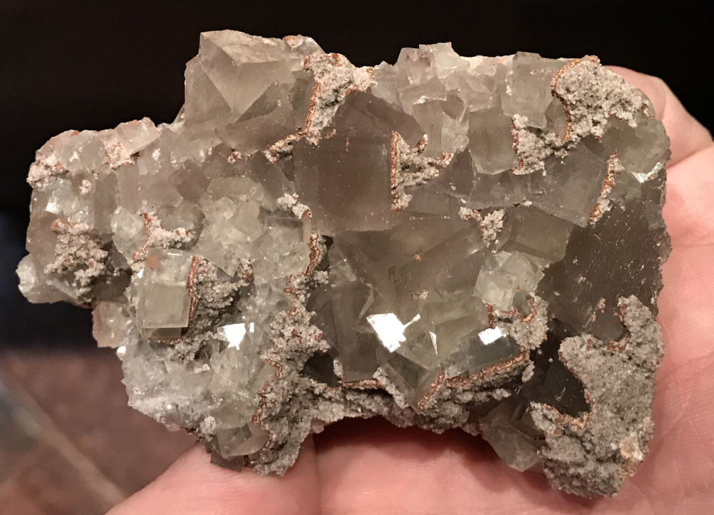 Fluorine en cubes gris partiellement incrustés d'un 'carbonate riche en fer' aujourd'hui limonitisé et incrusté d'une calcite de recristallisation [100mm]