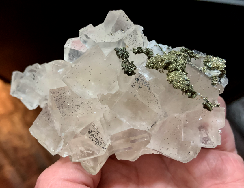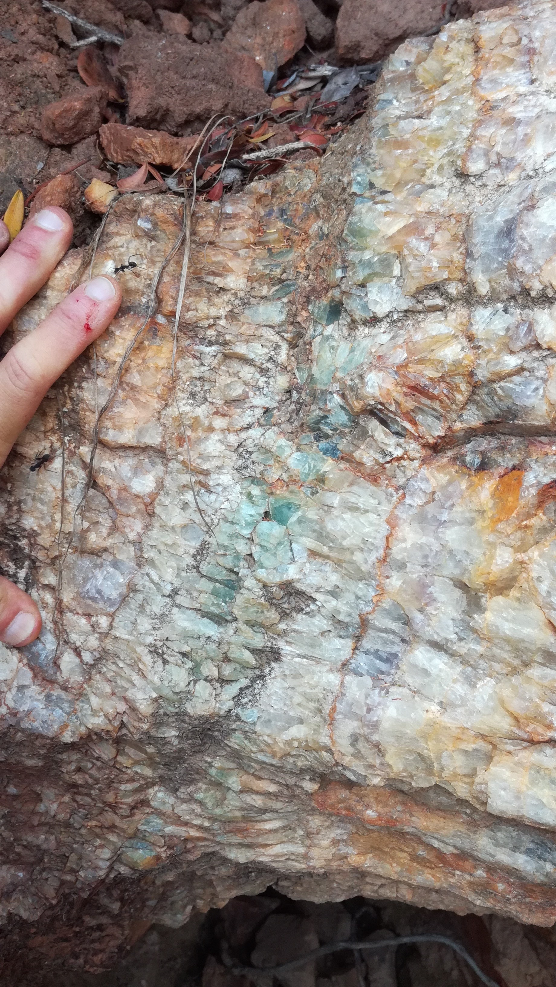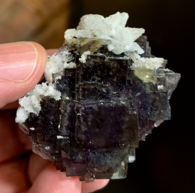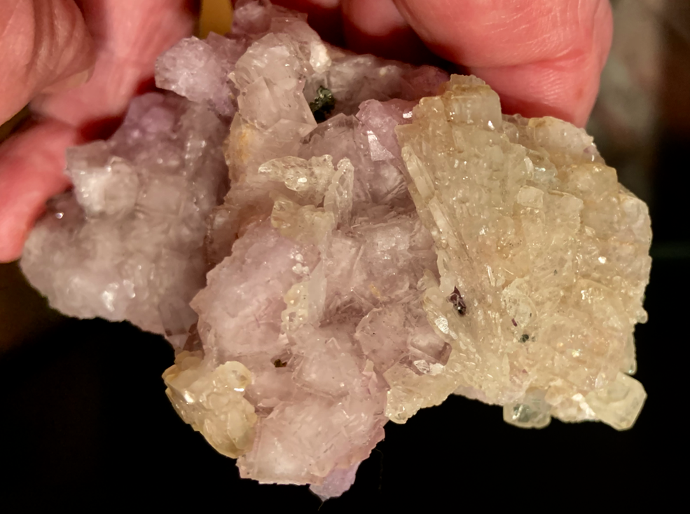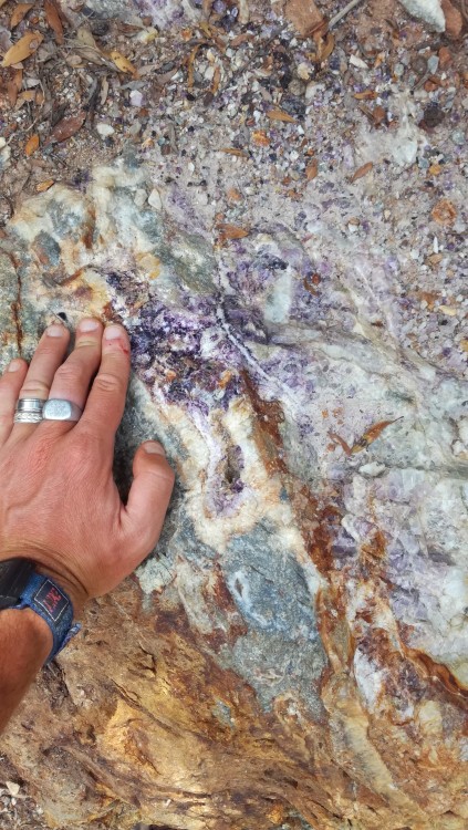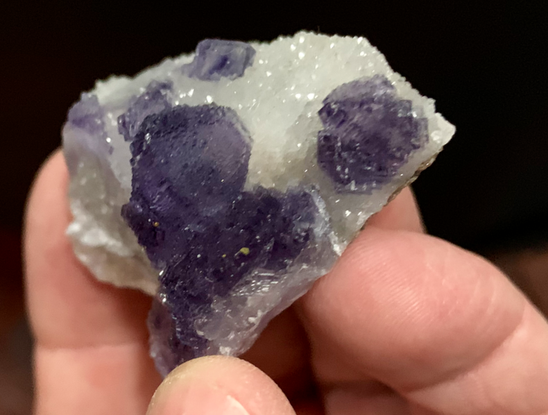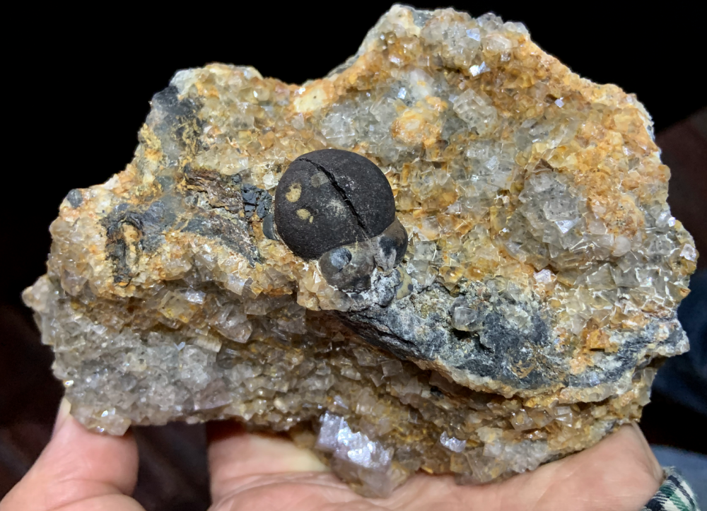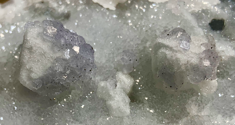 Les 'nodules' de fluorine, en patatoïdes totalement encroutés de fluorine incolore, mauve, violette sont communs dans certains filons. Ils sont sans doute d'origine brèchique.