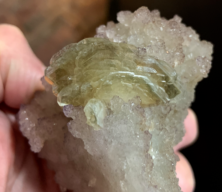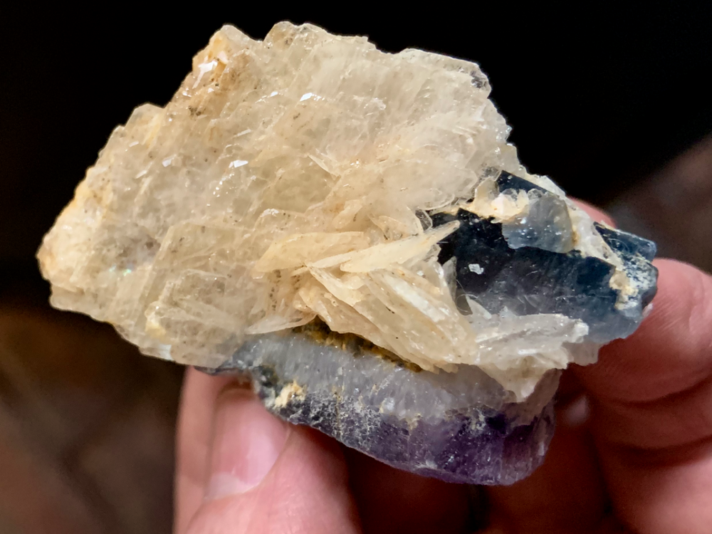 Barytine en lames polysynthétiques ambres en 'livre ouvert' sur Fluorine en petits cubes mauves [80mm]